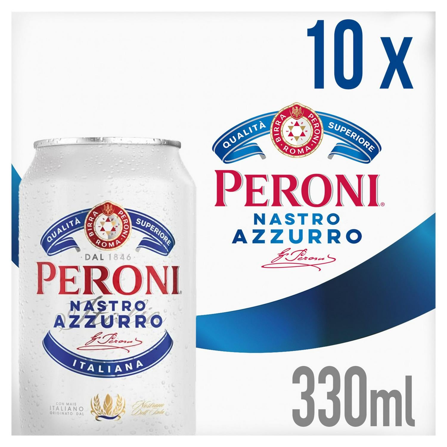 Brewed in Italy to the original recipe since 1963; Peroni Nastro Azzurro Italian beer delivers a crisp and refreshing taste with a delicate balance of bitterness and light citrus notes. Our exclusively grown Nostrano dell’Isola maize gives Peroni Nastro Azzurro beer its uplifting and unique taste, with a quick and dry finish. Peroni Nastro Azzurro can be enjoyed at all occasions and social moments where beer lovers are seeking a refreshing tasting premium Italian beer. Feel the invigoration of authentic Italian craftmanship, passion and flair with this pack of 10 x 330ml Peroni Nastro Azzurro cans, perfect for the fridge. Best served chilled. Taste Profile: Crisp taste with a slightly hoppy, subtle citrus aromatic notes. Light body with a clean and fast finish. Pack size: 10 x 330ml cans. ABV: 5.0% Ingredients: Water, barley malt, Italian maize, hops, natural flavours Be DrinkAware at www.drinkaware.co.uk