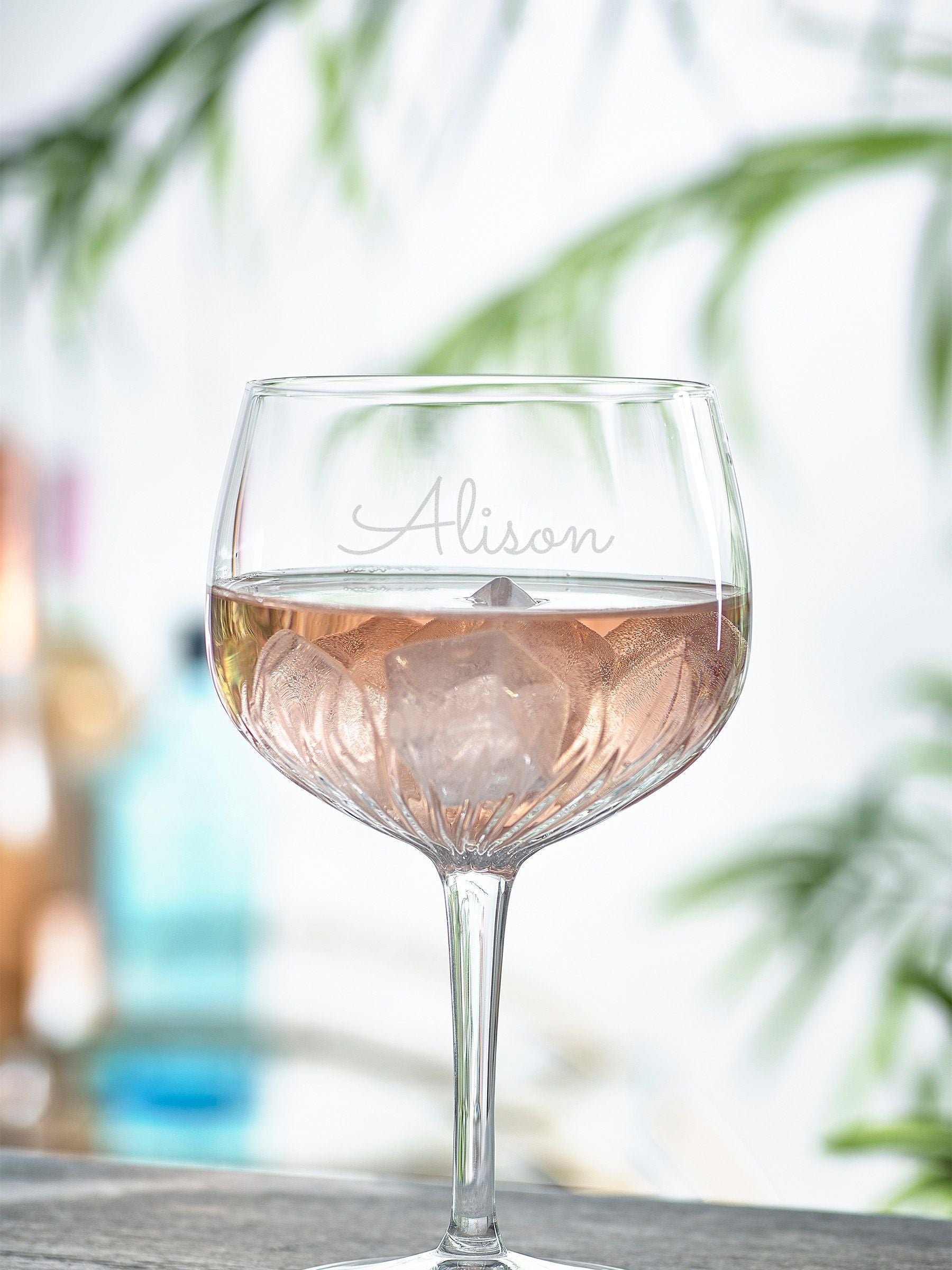 A truly show-stopping piece of glassware, the clear crystal glass has a long delicate stem, balancing the spherical cut crystal design with a flourishing personalisation, a perfect gift for anyone.