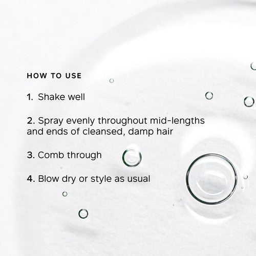 Shake well before use. Spray through mid-lengths and ends of cleansed, damp hair. Comb through to detangle. Blow-dry or style as usual.
