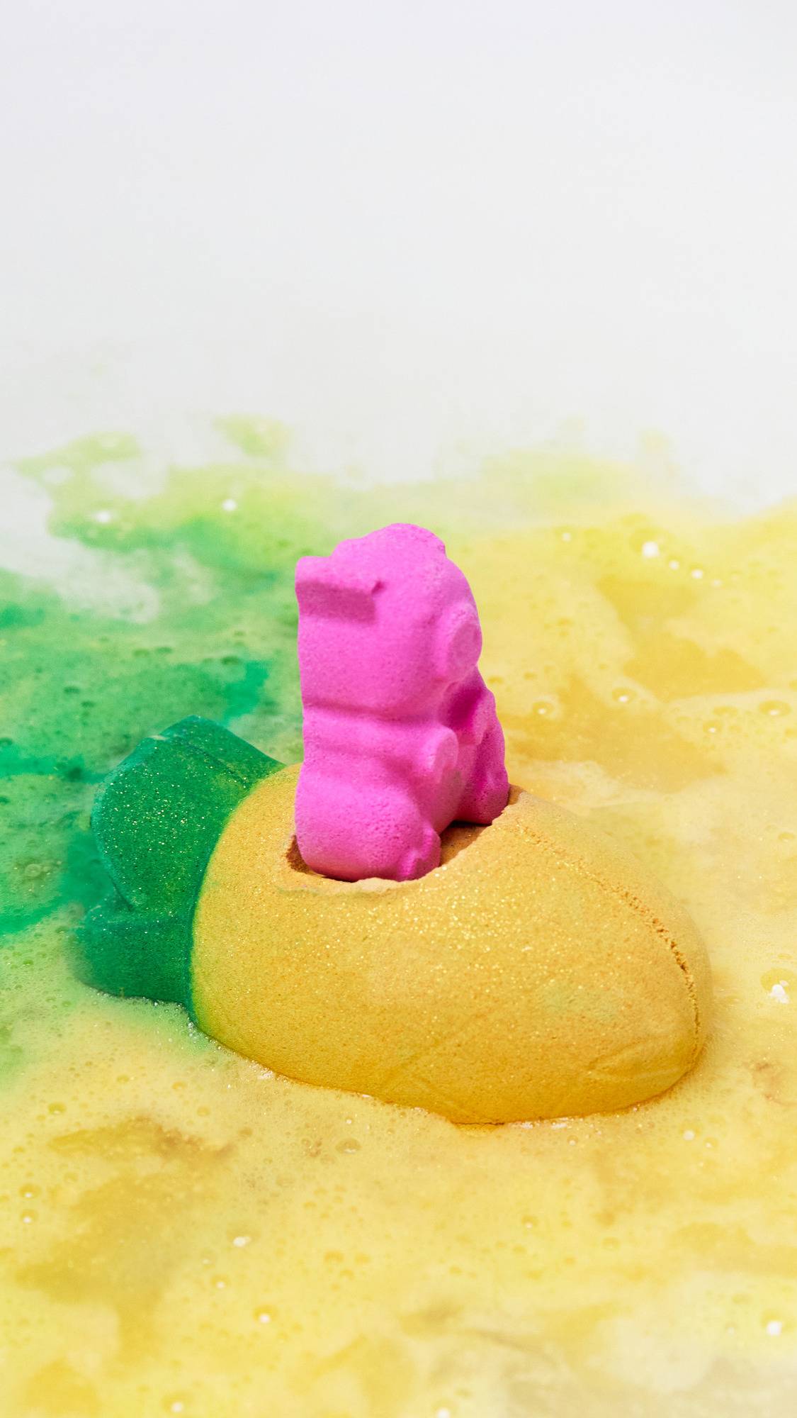 This 2-in-1 bath bomb is a sure winner! Whizzin' and fizzin' in your bath with this cuddly strawberry piglet and its speedy, sweet, yummy pineapple motor. This speedy little number's got a lot going on under the hood, with sweet, fruity, piña colada-inspired notes that're sure to get your engines revving. On the other hand, our little piggy behind the wheel is full of yummy fresh strawberry fragrance.