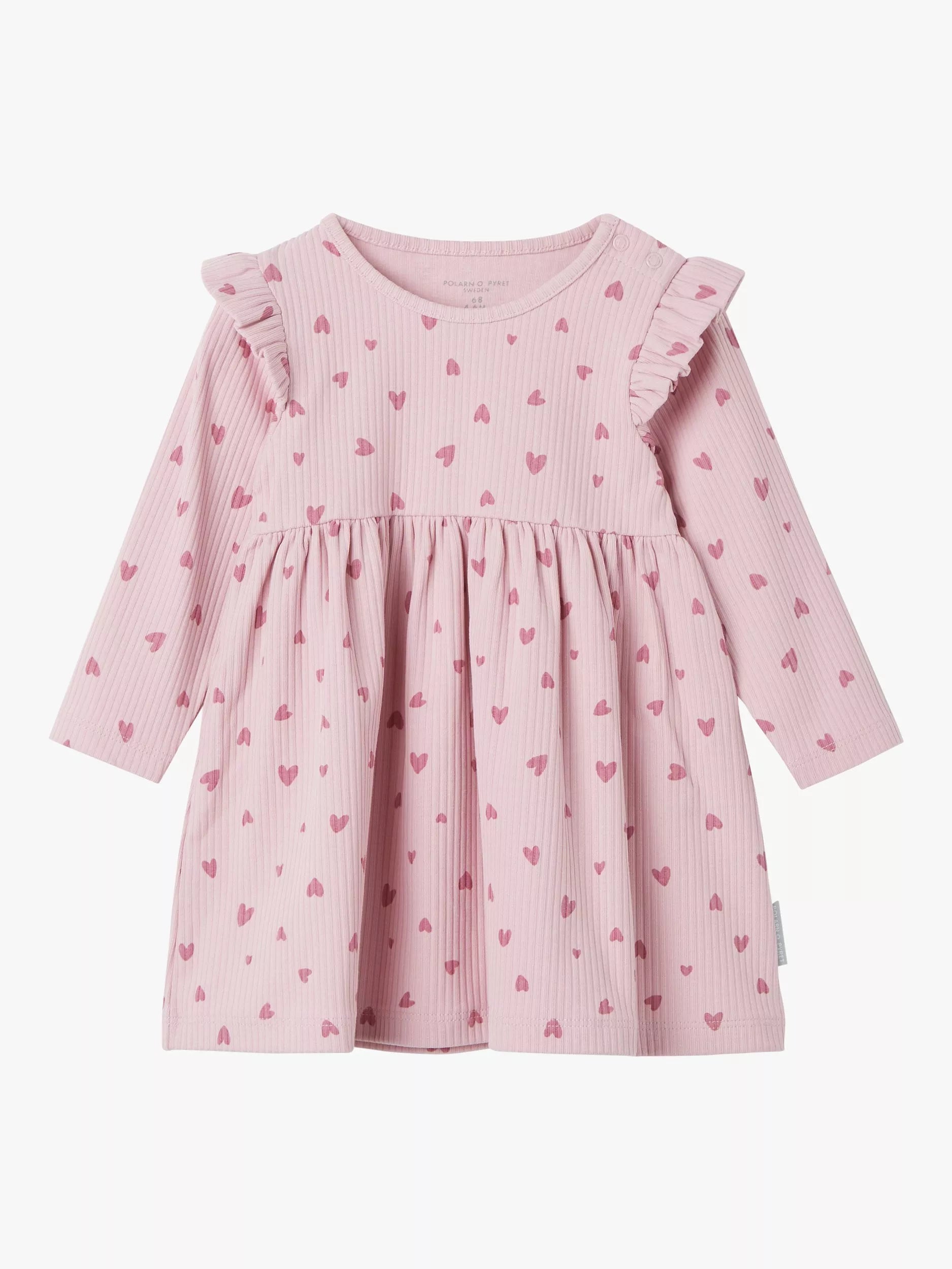 With a fit and flare design, this long sleeve organic cotton blend dress is a comfy option. Covered with a heart shaped print, it's designed with shoulder poppers to make dressing easier.