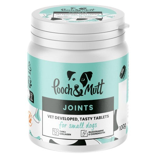 Pooch and Mutt Small Joint Supplement is a vet-developed formula designed as 'good mood food' for small breeds. This supplement provides targeted support using key components beneficial for joint health and mobility. Each tasty tablet is carefully formulated for easy administration.