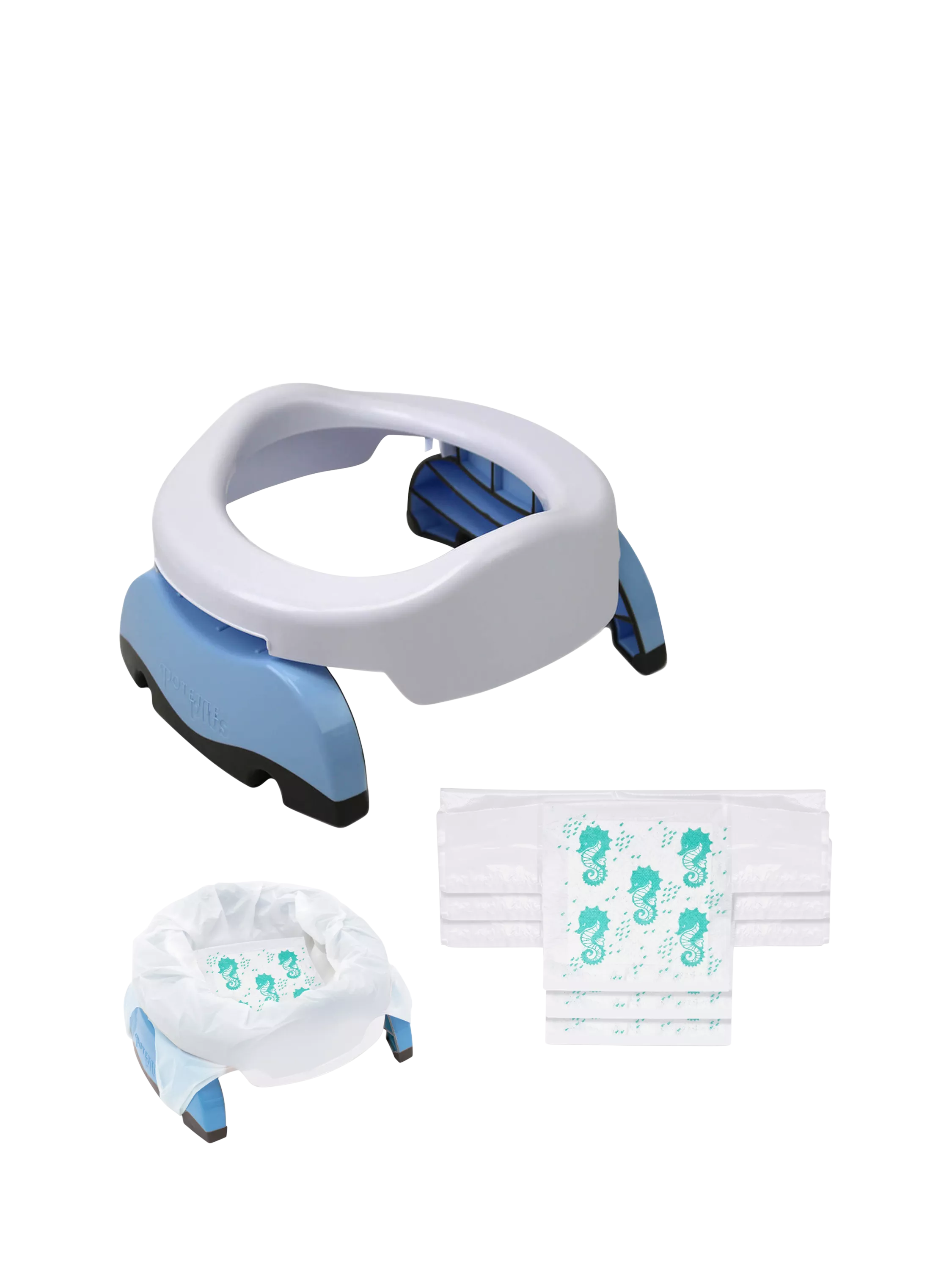 This full size travel potty has 3 absorbent liners and rubber feet to prevent it from sliding around. It turns into a folding toilet trainer seat, and has a hygienic travel bag to store it in.