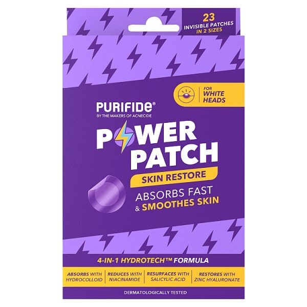 Purifide By Acnecide Skin Restore Power Pimple Patches Are High Performance Hydrocolloid Spot Patches Designed To Help You Get Rid Of Whiteheads Fast. A Unique 4-In-1 Hydrotech ™ Formula Works By Absorbing Impurities, Reducing Redness, And Helping To Resurface Your Skin For A Smoother, Healthier Look. Key Benefits: Clinically Proven Results In 8 Hours*: Helps Remove White Head Pimples While Repairing And Resurfacing The Skin Leaving It Looking Healthier Invisible Second Skin Comfort: Skin Restore Patches Are Virtually Invisible, They Will Stay In Place All Day Or Night And You Can Wear Them Discreetly Under Makeup Water And Sweatproof: Stays In Place Even When You'Re Active. Comfortable: Designed To Be Comfortable And Stay In Place All Night Long. Two Sizes: An Easy Peel System For Big And Small Blemishes Co-Developed With Dermatologists: Does Not Clog Pores, Fragrance-Free, And Vegan Why Skin Restore Patches Are Better Than Hydrocolloid Alone Purifide 4-In-1 Hydrotech ™ Formula Is A Blend Of: Hydrocolloid Technology: Helps To Quickly Absorb Pus And Impurities From Whiteheads. Niacinamide: Helps To Calm Inflammation And Reduce The Appearance Of Redness. Salicylic Acid: Gently Exfoliates To Help Smooth And Refine Your Skin'S Texture. Zinc Hyaluronate: Helps Prevent Marks, Has Anti-Bacterial Properties, And Strengthens The Skin Barrier. Purifide Was Created By The Makers Of Acnecide; The No.1 Spot Treatment Brand**. As Experts In Clearer Skin, We Have Curated A Range Of Skincare Products And Effective Solutions That Cover A Wide Spectrum Of Spot And Blemish Prone Skin Types And Goals. Whatever You Need, We’Ve Got You Covered. *Independent Clinical Study Cro: Spincontrolfr + Can Spr.3446.207372, 62 Participants ** Based On Nielseniq Rms Data For The Mass Medicated Category For The 12-Month Period Ending 18.05.2024 For The Great Britain Total Retail Market (Copyright © 2021, Nielseniq) For Verification, Email: Acnecide.Uk@Galderma.Com