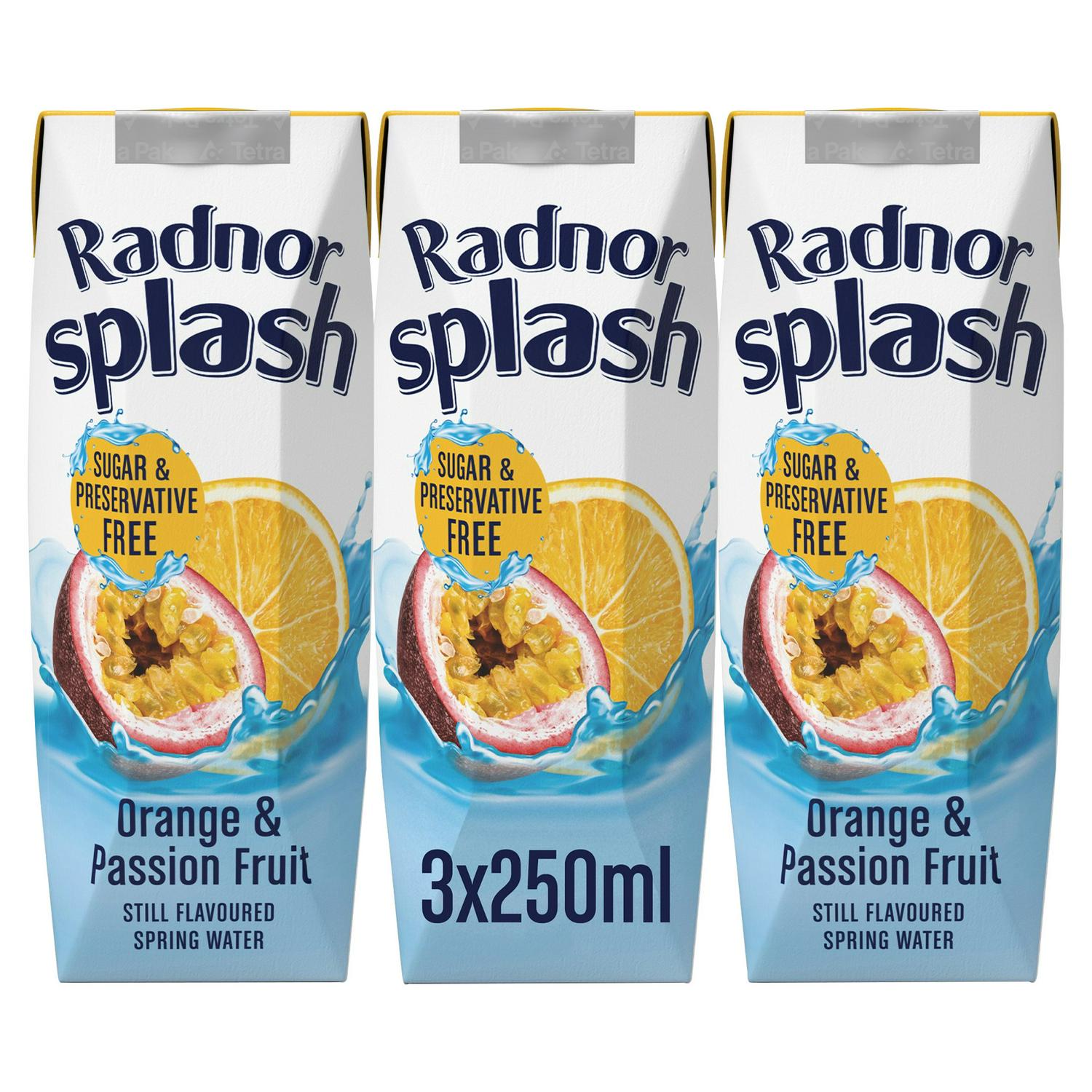 This Radnor Splash offers a vibrant and punchy refreshment, perfectly blending lively orange and passion fruit flavourings with pure, clean still spring water. This ready-to-drink beverage is manufactured using only all-natural flavourings derived directly from selected fruit sources. The product is supplied in a convenient multipack containing three 250ml Tetra cartons, which are designed to be fully recyclable.