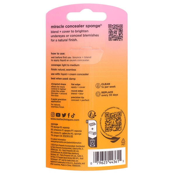 The Real Techniques Limited Edition Miracle Concealer Sponge assists in blending and concealing targeted areas of the face, such as blemishes or under-eye darkness. It is engineered to deliver light to medium coverage, resulting in a natural, seamless finish that provides a subtle lifted effect.