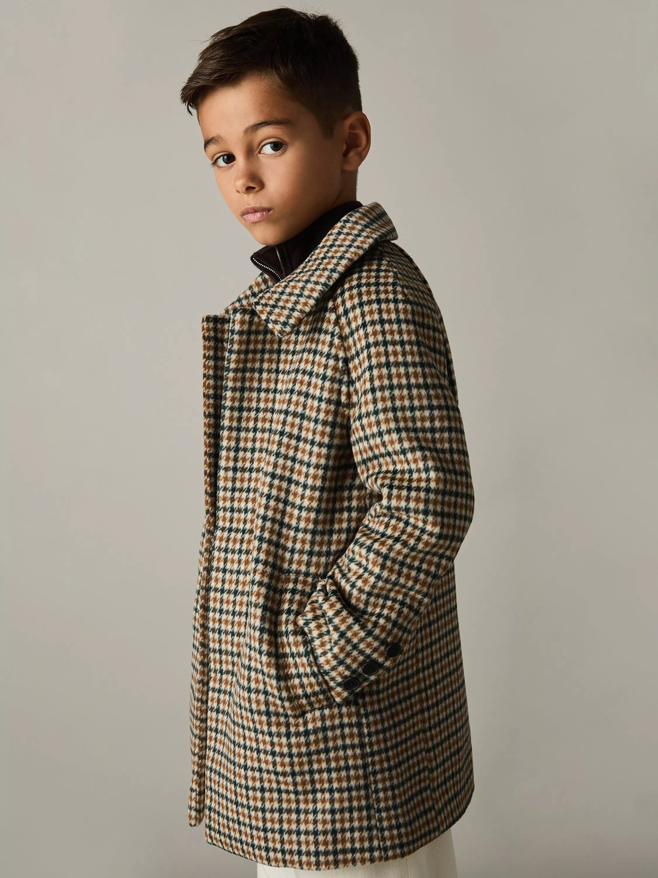 The Region coat strikes a refined note. Crafted from a double-faced wool blend that's patterned with Shepherd's checks, it has a spread collar, welt pockets and concealed front buttons.