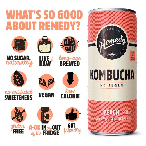 This Remedy sparkling kombucha offers a naturally delicious and refreshing drink experience. It is a naturally fermented beverage crafted with bright peach and warm vanilla flavours.