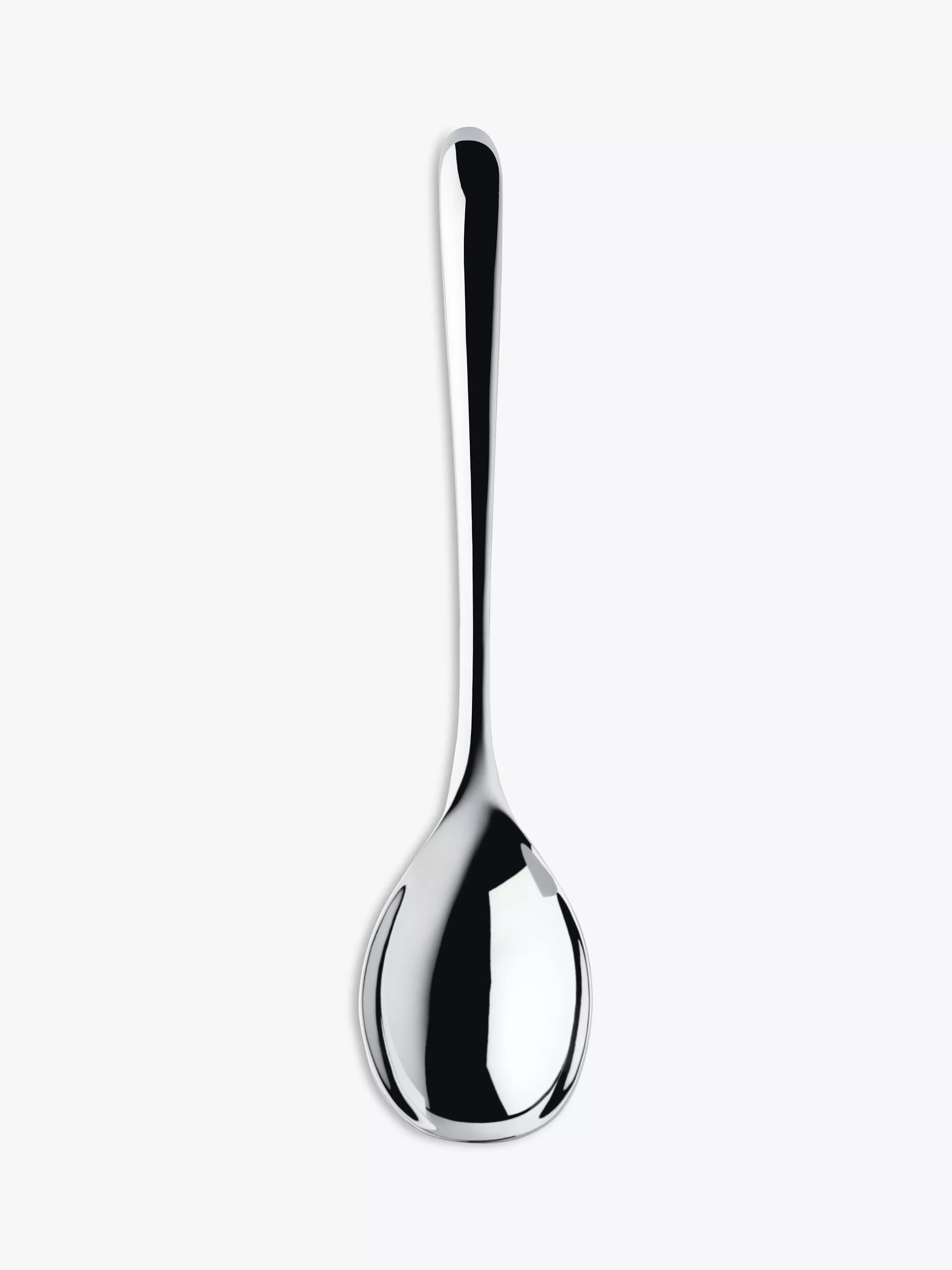 A deep bowl solid serving spoon from the award-winning Robert Welch Signature utensil range. The hook base has been engineered to provide stability when sat on a flat surface and prevents the utensil from sliding into the saucepan.