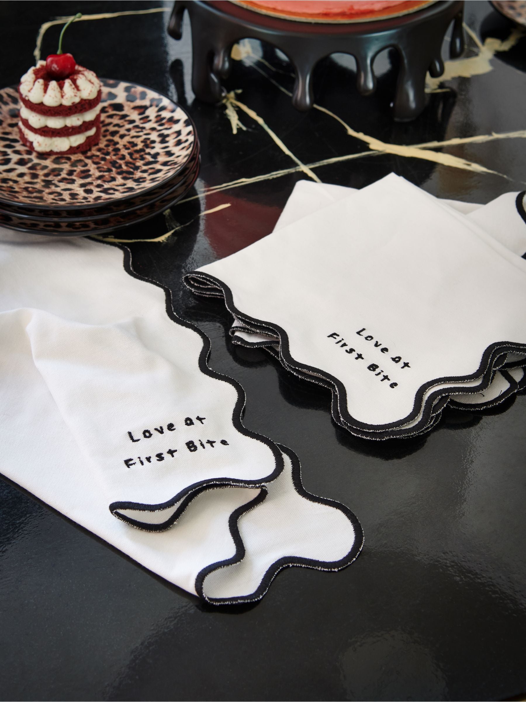 Add these quirky Rockett St George First Bite Napkins to your tablescape for a fun and flirty finish. Made from pure cotton with scalloped edges and embroidered slogan. Read More
