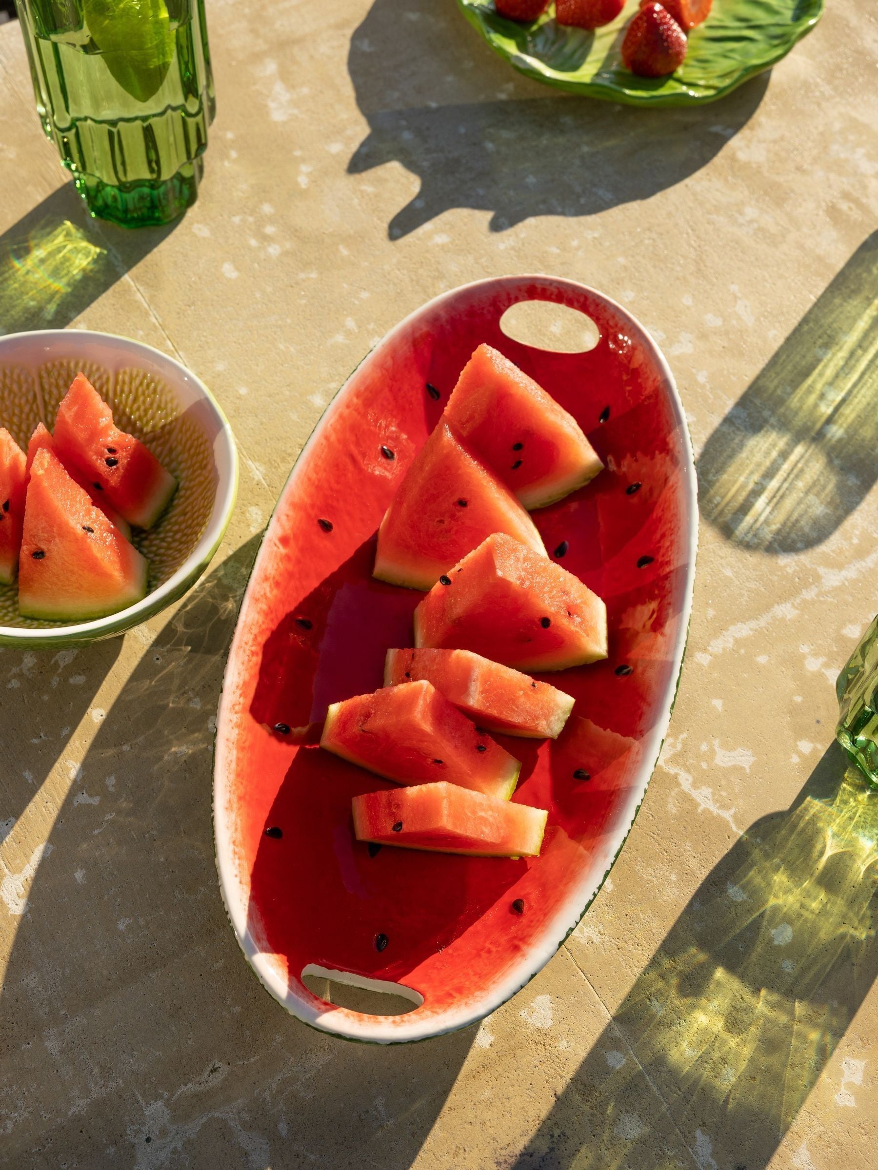 The Watermelon Serving Plate brings a burst of summer to any occasion, with its playful yet sophisticated design. Crafted from dolomite ceramic, this oval platter is not just a functional piece for serving food but also a statement on your table. The inside of the plate features a hand-painted red finish with intricate black seed details, while the outside showcases a textured, green mottling that mimics the natural appearance of a watermelon rind. It s the perfect way to serve fruit, snacks, or even create a beautifully styled grazing platter or cheese board.