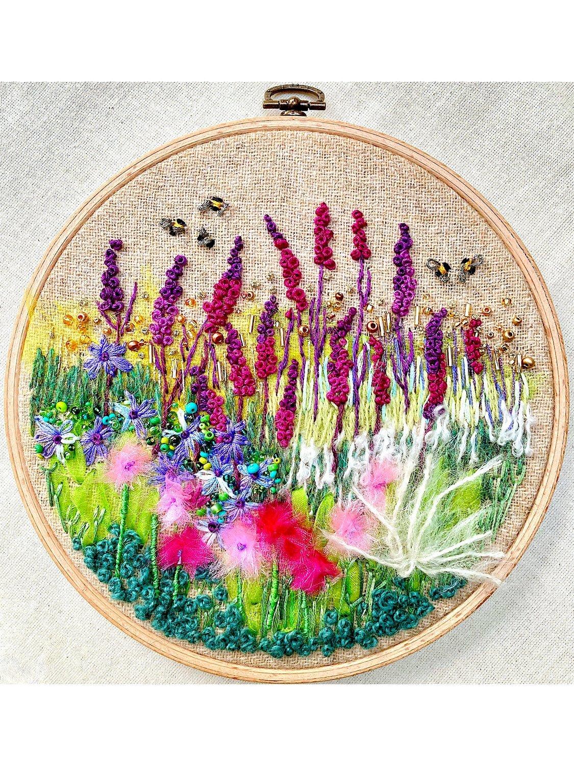 This gorgeous embroidery kit is stitched on Rowandean's own unique, natural colour 100% wool fabric. Fluffy organza carnations spill across the foreground while the flower spikes of Loosestrife 'Beaujolais' punctuate the horizon line.