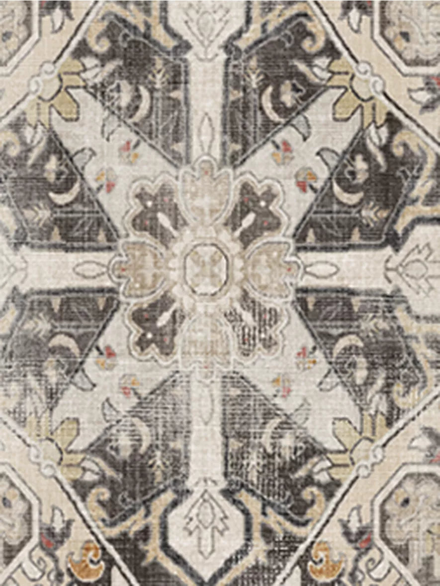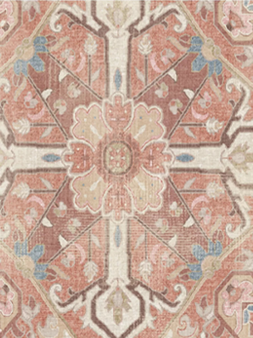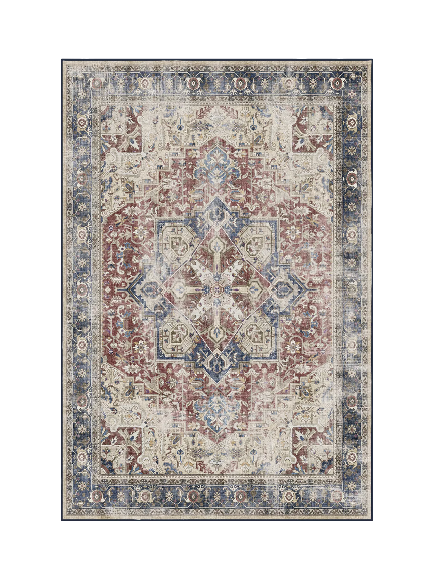 A Persian design with a distressed look. Inspired by traditional Heriz rugs, Ruggable's Kamran rug features a large medallion with an ornate border in rich shades of vintage colours. Water-resistant, stain-resistant, and machine-washable.