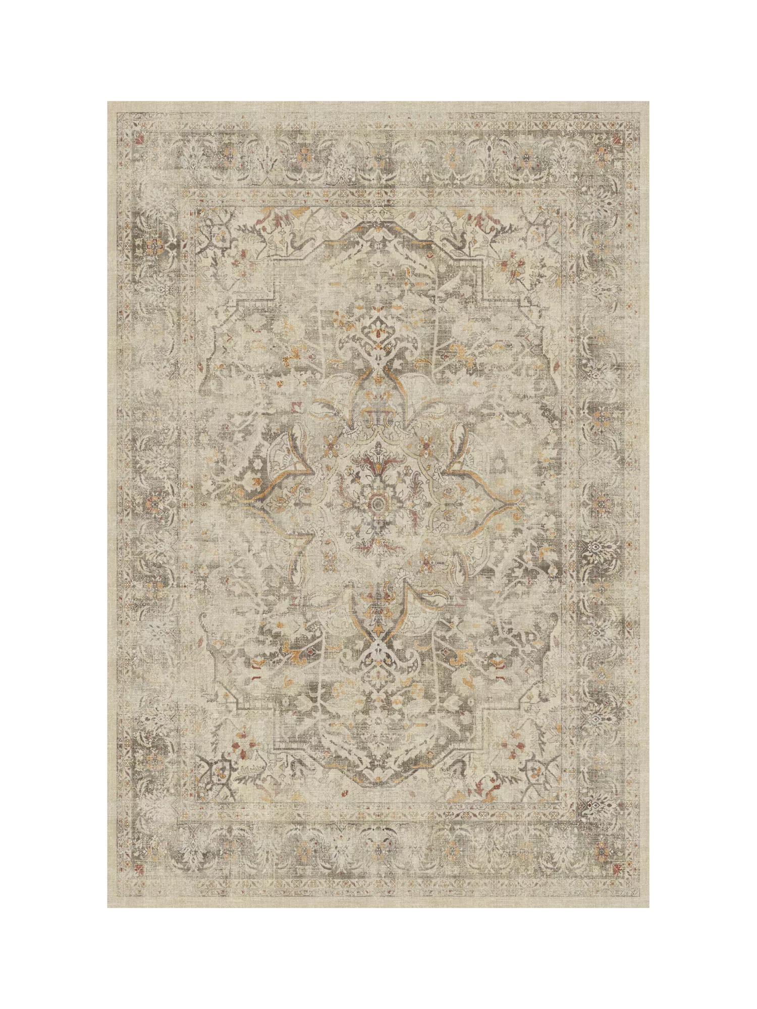 Warm and rustic. Beautiful shades blend together in this rug to create a beautifully rich, distressed design featuring a floral medallion and border. Water-resistant, stain-resistant, and machine-washable.