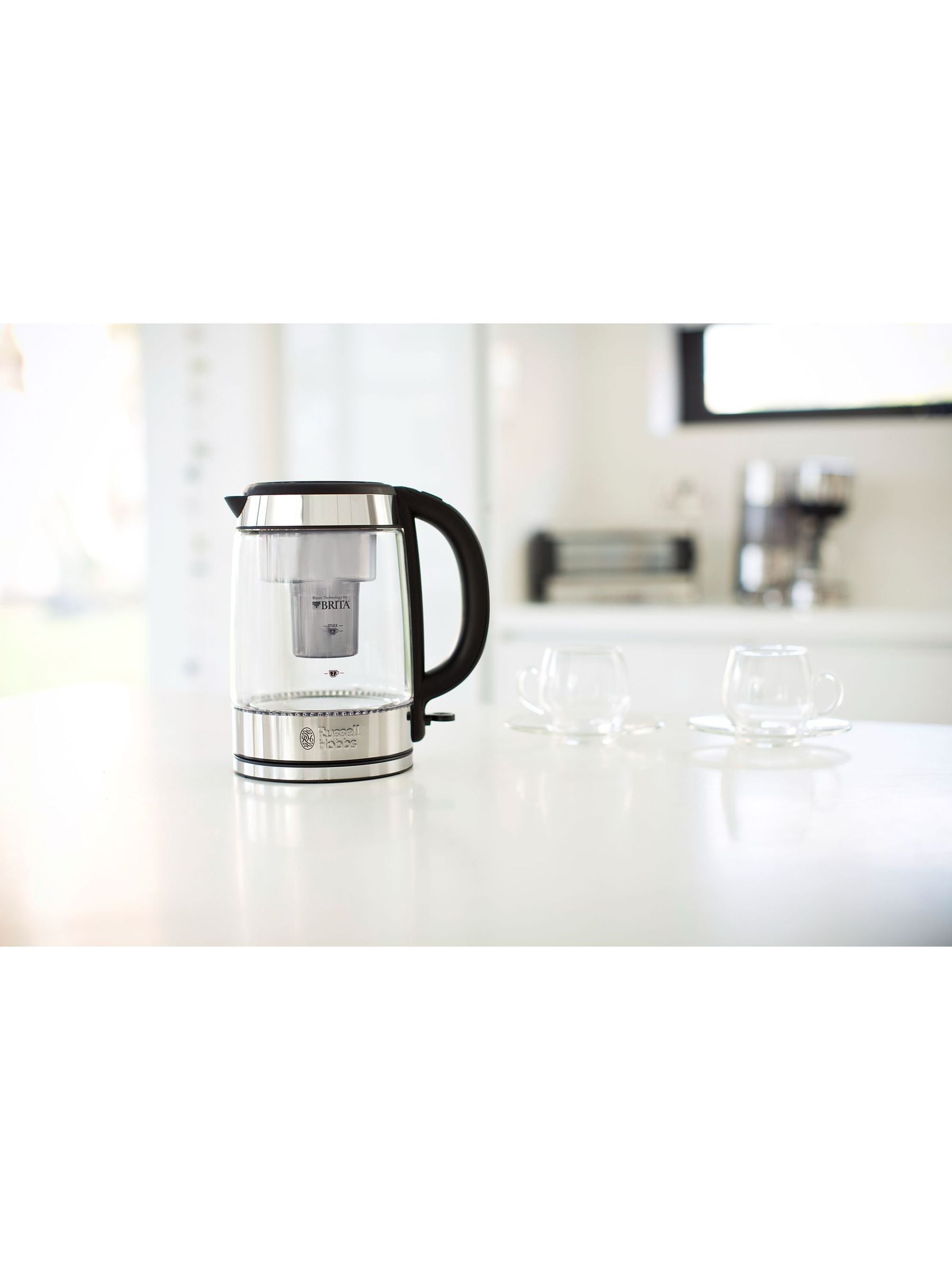 The super stylish Russell Hobbs Purity Glass Kettle has a built in Brita water filter system that reduces limescale and chlorine and permanently absorbs any copper and lead that colour occur in tap water. Features. Over time, chemicals can sometimes leave residue or a bad taste in your hot drink. Its built in Brita water filtration system removes these impurities. To make sure every litre of water you boil remains pure, there is a handy built in alert to remind you when the cartridge needs to be replaced. The purity glass kettle embodies a timeless simplicity of style, with high quality glass casing so you can watch the water as it boils. As a temperature rises, the water is infused with soft blue light which illuminates at its brightest when boiling point is reached. To keep to your work top clutter free, the base has integrated cord storage so it can be tidies away when it s not in use. The Russell Hobbs Purity Glass kettle incorporates BRITA advances MAXTRA+ advanced filtration technology that goes a long way a make a better tasting hot drink. With its sleek and stylish housing it will also make a style statement in any kitchen. Includes Brita Maxtra filter cartridge. The BRITA MAXTRA+ Filter reduces the build up of limescale in the kettle, as well as reducing chlorine and permanently absorbing copper and lead. Cleaner, Clearer, better tasting tea and coffee. The advanced BRITA Filter technology reduces taste impairing substances, allowing the full flavour and aroma of your hot drinks to shine through.
