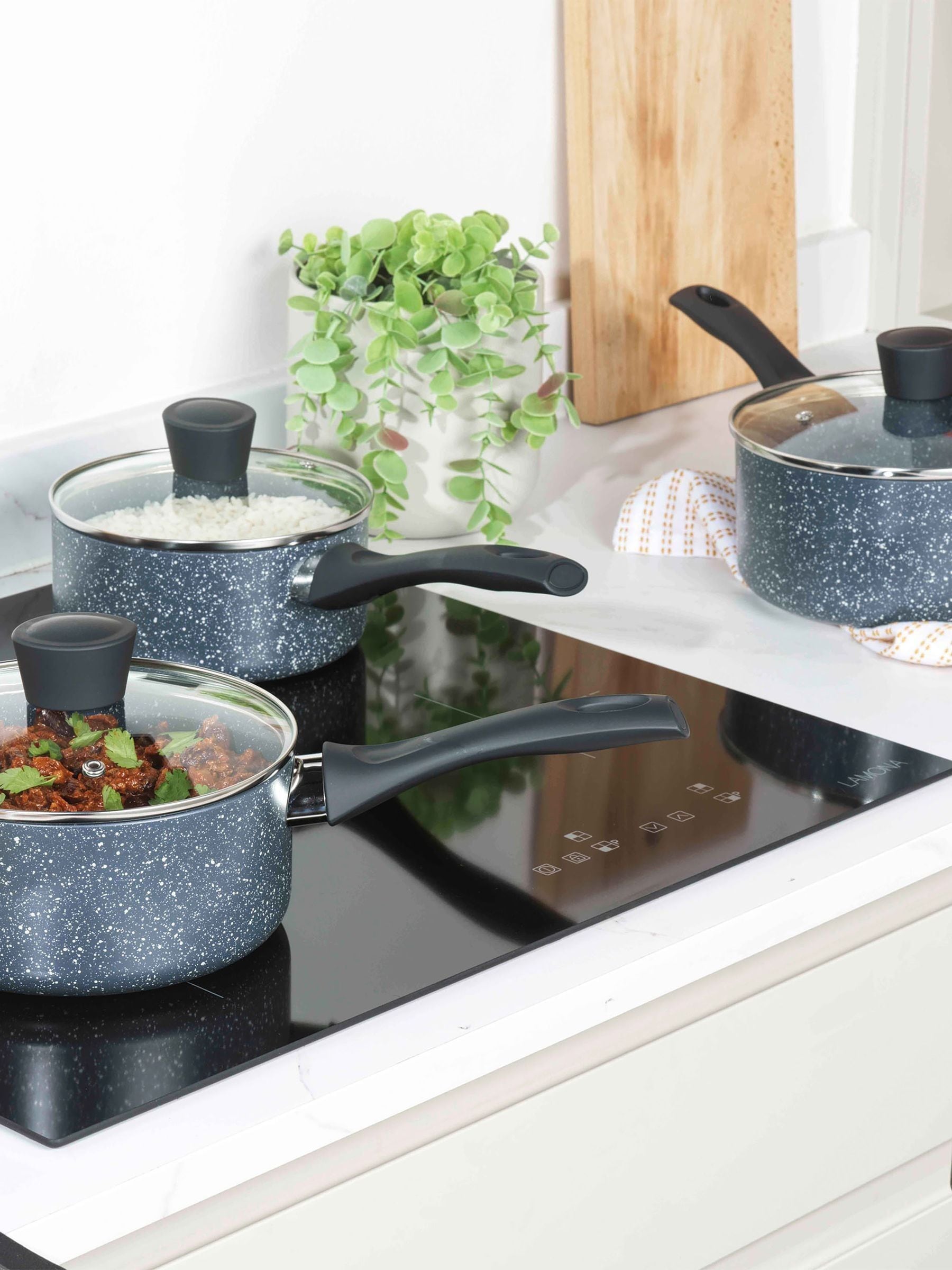 Crafted to perfection, this Russell Hobbs Nightfall Stone saucepan set is compatible with all types of hobs including induction, ensuring remarkable heat distribution for even cooking. The tempered glass lids included are great for monitoring your cooking progress without releasing heat. The premium non-stick surface guarantees effortless food release and incredibly easy cleanup. Avoid releasing harmful chemicals into your food thanks to the PFOA-free coating for a healthier cooking experience.
