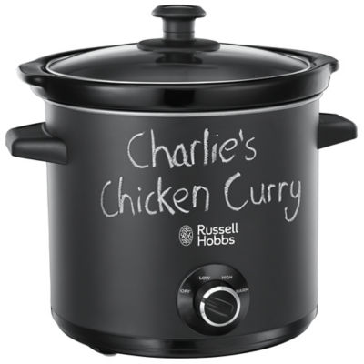 Russell Hobbs Chalk Board Slow Cooker – the first word in creative cooking Make a note - this generous 3.5 litre slow cooker is perfect for family meals The Russell Hobbs Chalk Board Slow Cooker in stylish Matt Black is a cookpot with a twist. As well as providing all the advanced and clever features that make Russell Hobbs Slow Cookers indispensable, the Chalk Board housing means you can write on it too. Whether you want to leave little notes for the family telling them what’s for dinner or you want to keep track of a recipe – this creative concept will get everyone talking. Perfect for stews, roasts, chillis, soups and more Chalk Board Casing Matt black powder finish allows you to write on the sides of the pot using chalk. Leave messages for the family, tell them what’s cooking or keep a note of your ingredients or timings if you’re following a recipe. Product Features •3.5L capacity slow cooker •Ideal family size slow cooker, cooks up to 4 portions of food •Matt Black Chalk powder coating •2 pieces of chalk that can be used to write on the body •3 heat settings, high, low, warm •Glass lid to view food whilst cooking •Removable black ceramic pot & lid for easy cleaning •Power indicator light •Non slip feet