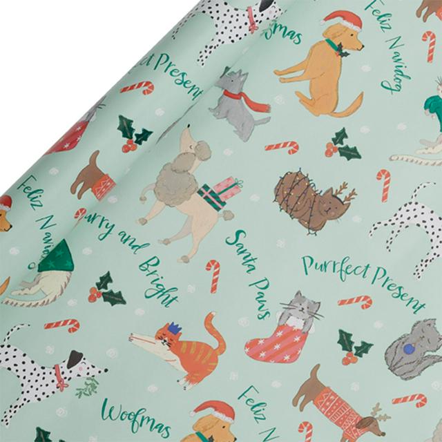 Yappy Christmas. Featuring dogs and cats in their festive finery, this 4m roll of wrapping paper is a great choice for presenting the pawfect present. Plus, it’s recyclable too.