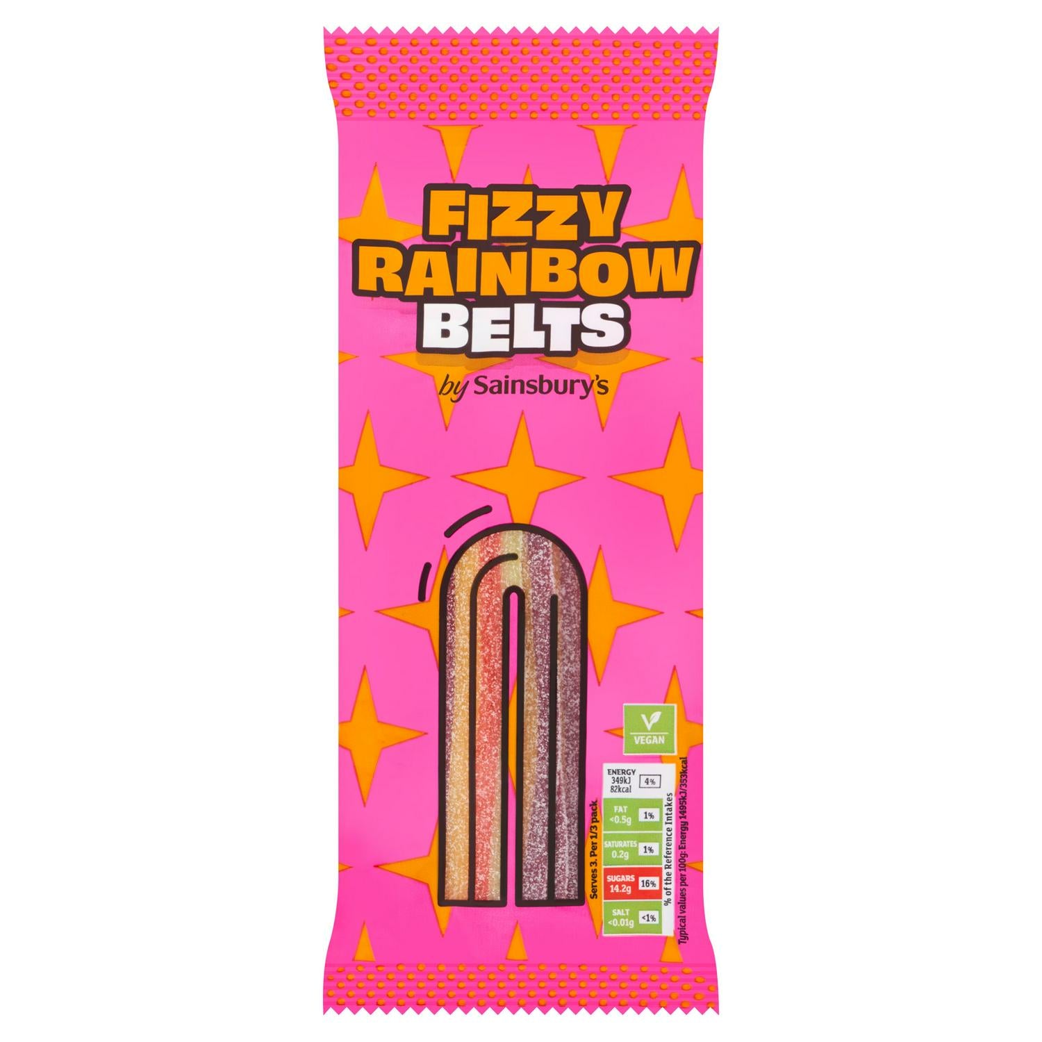 These Sainsbury's Fizzy Rainbow Belts offer a vibrant confectionery experience with their multicoloured fruit flavouring. Each chewy belt is finished with a noticeable sour sugar coating for an enhanced flavour profile. This popular sweet treat is also clearly certified as suitable for vegans.
