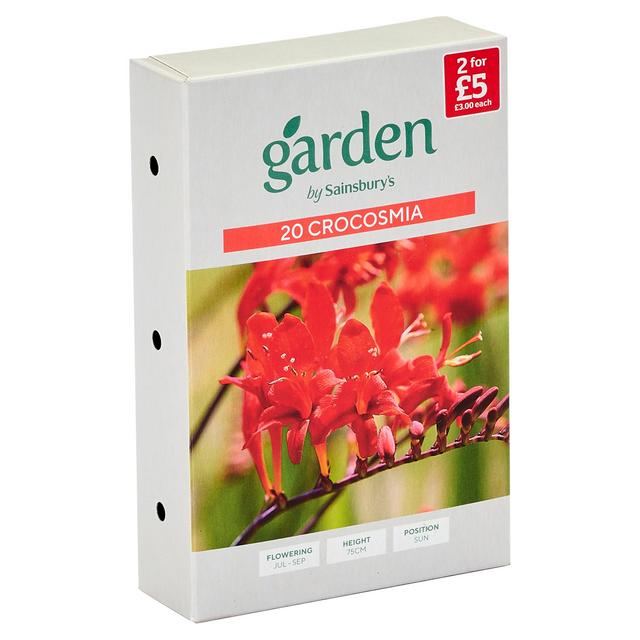 Enhance your outdoor space with these Crocosmia flower bulbs from garden by Sainsbury's. This convenient pack contains twenty bulbs ready for planting to create a vibrant summer display. These visually striking plants thrive when positioned in areas receiving full sun throughout their growth cycle.