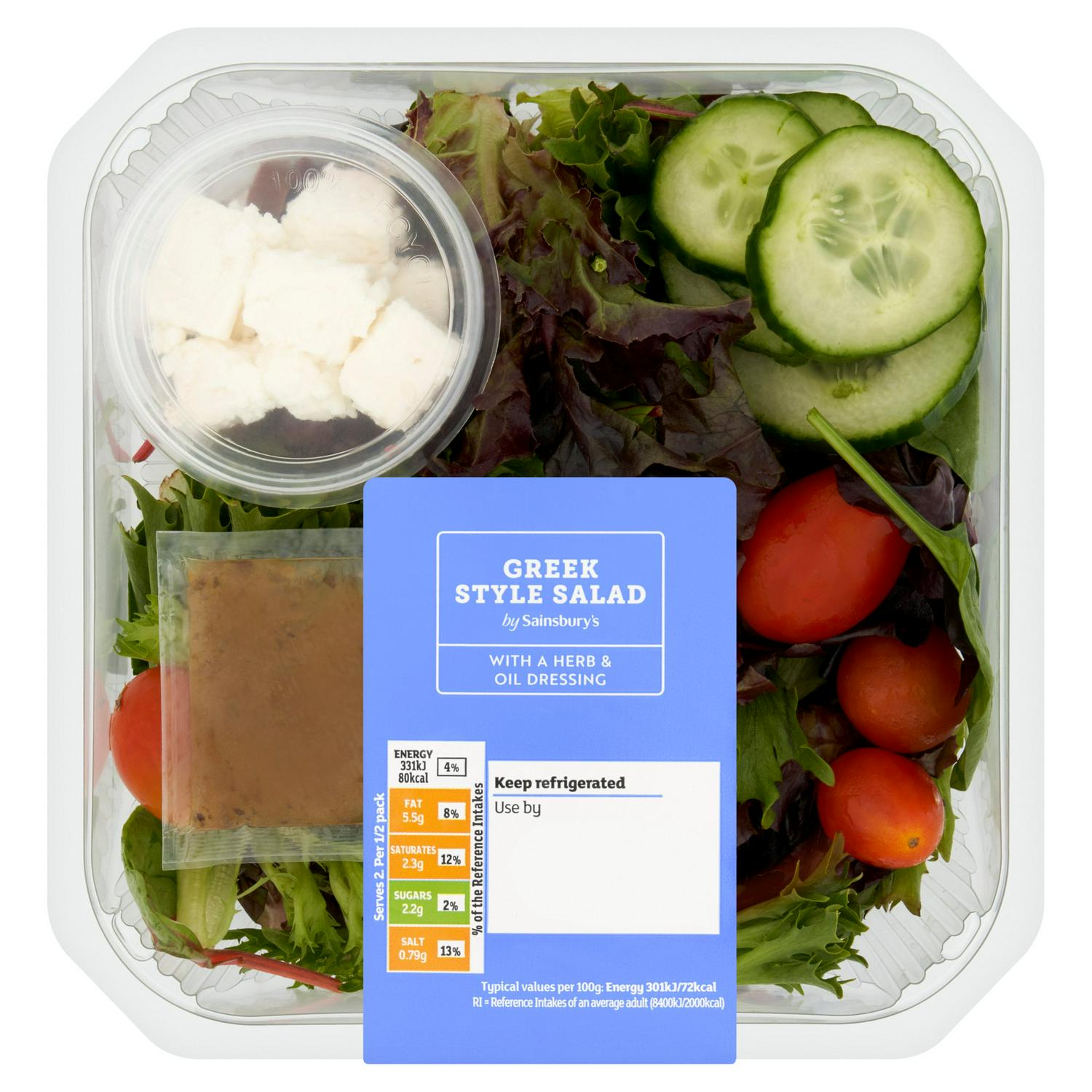 Read MoreMixed salad leaves, tomatoes and cucumber with feta cheese, Kalamata olives and a sachet of herb and oil dressing