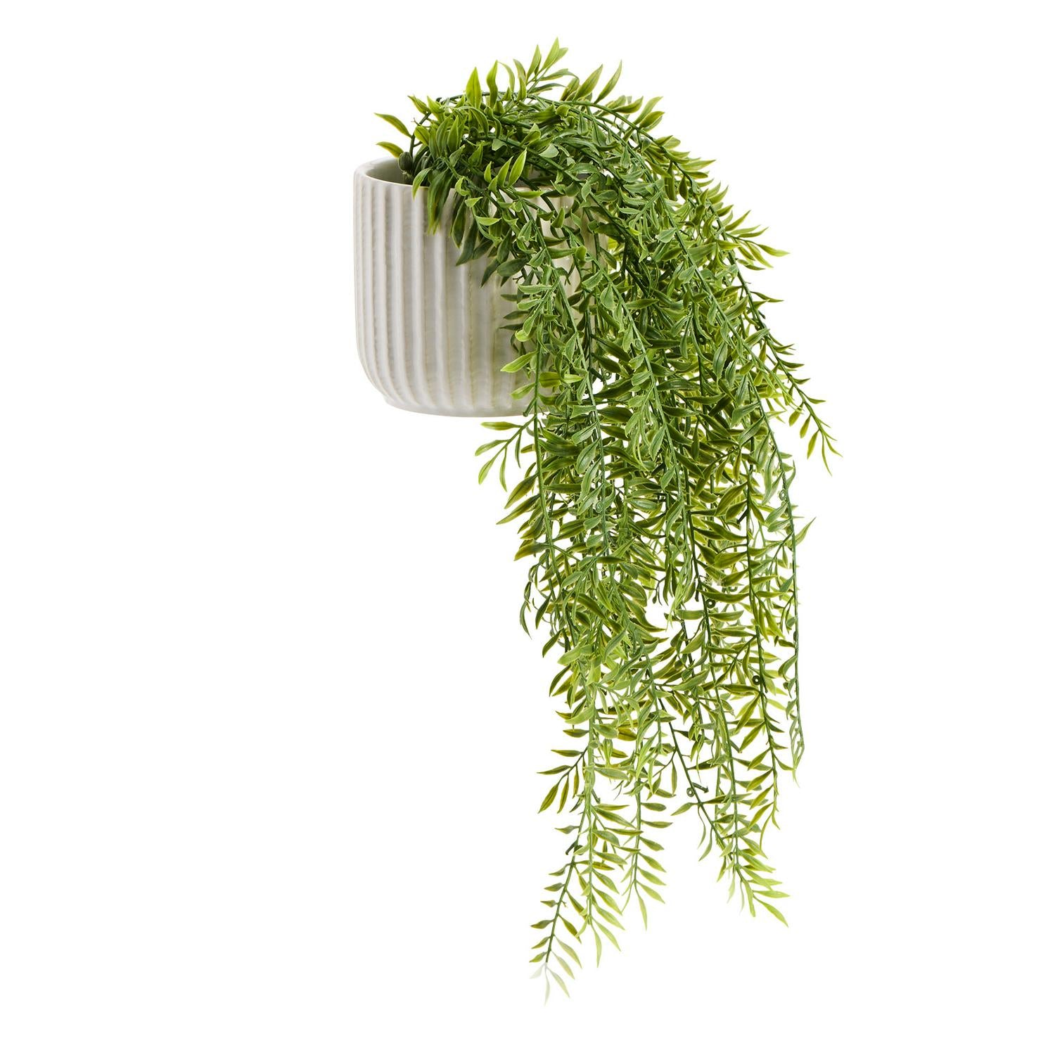 Read MoreDrapes gracefully. Sways gently. This hanging fern will add a touch of nature to a shelf, windowsill or side table. Comes in a stylish cream ridged ceramic pot. Go fuss-free with this faux plant.