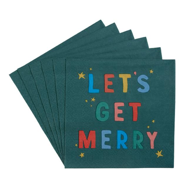 Set a festive mood with these 3-ply paper napkins featuring a 'Let's Get Merry' design. This pack contains twenty disposable napkins, ideal for your seasonal gatherings. The napkins are manufactured using tissue sourced from FSC-certified forests, ensuring responsible woodland management.