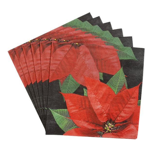Product details Description A bold and beautiful design. Rich red poinsettias punch out of a dark background. This pack of 3-ply paper napkins are almost too nice to use. Luckily, there are 20 in a pack, so plenty to go around. • Each napkin measures 33x33cm when opened and 16.5cm... Read More