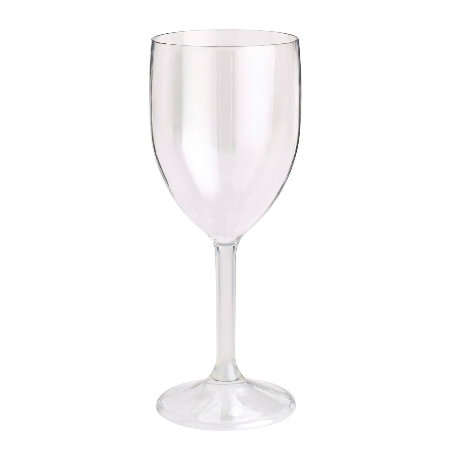 • Strong reusable clear plastic wine glass.