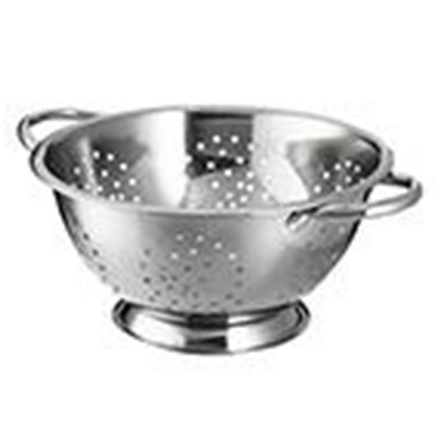 This stainless steel colander is designed to efficiently drain water from foods like pasta and fresh vegetables. Its durable construction ensures longevity in the kitchen environment. The functional design incorporates helpful features for everyday food preparation tasks.