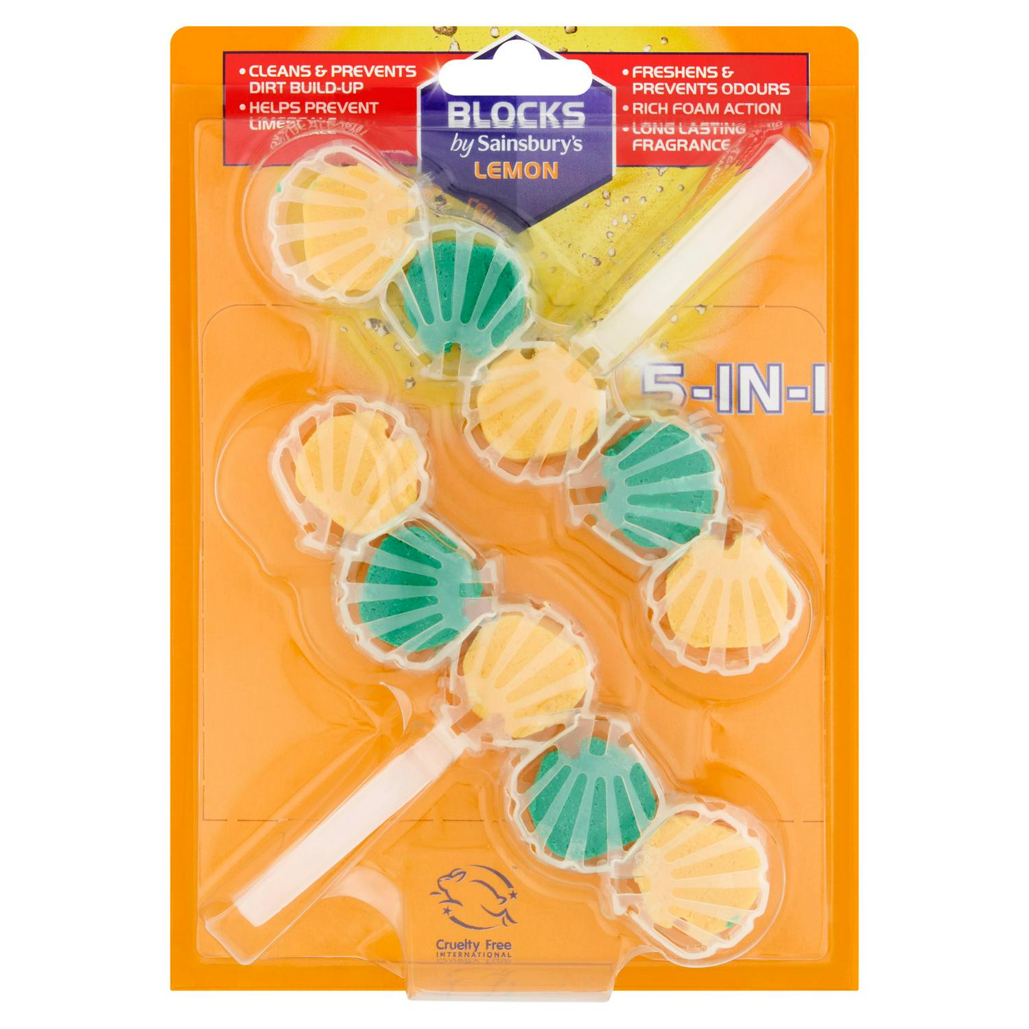 Sainsbury's BLOCKS provide a comprehensive 5-in-1 solution for maintaining a consistently clean and fresh toilet bowl. These lemon-scented units activate with every flush, delivering reliable cleaning power. The formulation is engineered to tackle several common maintenance tasks effectively throughout the day.