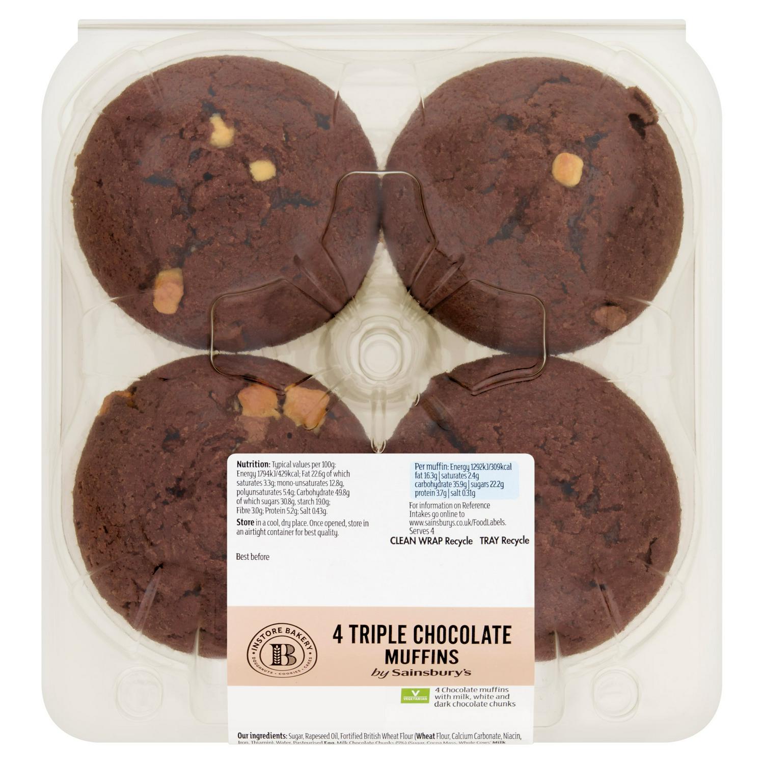 These Sainsbury's Triple Chocolate Muffins come conveniently packed as a set of four ready-to-eat treats. Each muffin is richly blended with milk, white, and dark chocolate chunks, ensuring a decadent flavour profile in every bite. Baked by the instore bakery, they offer dependable quality for an indulgent snack or dessert. This pack is suitable for vegetarian diets, providing a satisfying option for many consumers.