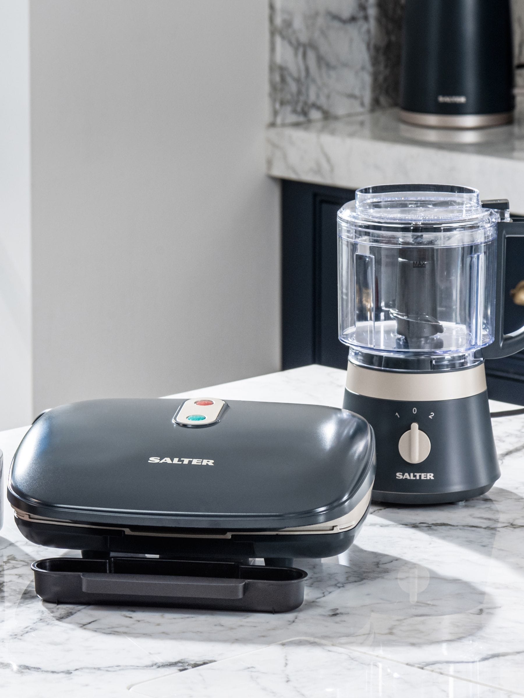 The Salter Marino Compact Food Processor is the perfect kitchen accessory to prepare limitless, flavourful food. Whether you are chopping fresh vegetables or whip up tasty dips, this powerful 400W mini chopper has you covered. The chopper features durable stainless-steel blades for optimum precision and is designed with two speed settings to reach your desired consistency. With a detachable BPA-free 500ml bowl and feeding chute, you can control the ingredients whilst adding oils and dressings. *Make light work of food prep using this compact food processor from the Salter Marino range, designed with a stylish blue grey finish. *Perfect for creating dips, salsas and sauces, the mini chopper features 2 adjustable speed settings so you can achieve your desired texture. *The food processor is equipped with stainless-steel blades for precise results and has a detachable chopping bowl for easy cleaning. *With a compact design, this salad chopper is a perfect fit for smaller kitchen spaces and can be easily stored away after each use. *Featuring a 500ml chopping bowl, this powerful 400W vegetable chopper is designed with a feeding chute for adding oils and dressings. Originating as a family business and now the UK’s oldest housewares brand, Salter is as trusted today as it always has been.