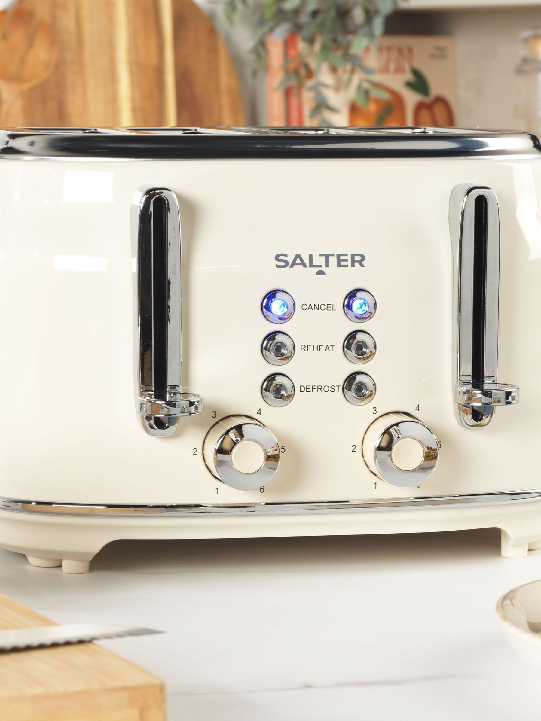 This Salter Retro 4-Slice Toaster is the perfect addition to any kitchen. Its wide slots can accommodate up to four slices of bread, thick buns, and bagels. You can choose from six different browning levels so your toast is browned to how you like it. It also comes with a defrost, reheat, and cancel functions giving you control over the final outcome. There's also a removable crumb tray so cleaning up is easy and a high-lift eject for smaller items. The self-centring feature makes sure all your toast comes out evenly browned.