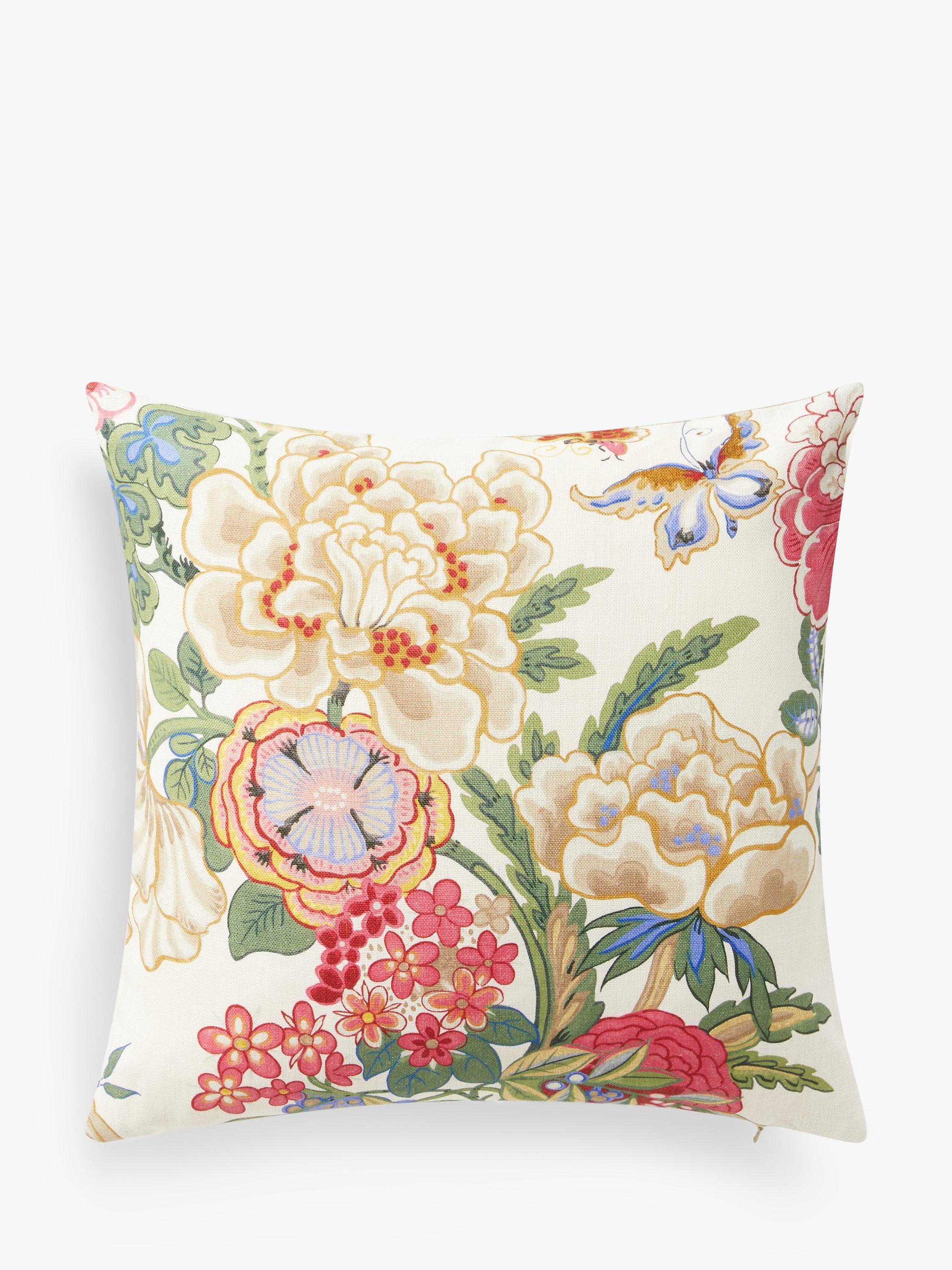The Sanderson Emperor Peony Cushion displays a distinctive Chinese-inspired decorative aesthetic, taken directly from a 1920s Jeffrey & Co. archive textile design source material. It meticulously renders large, opulent peonies alongside intricate tropical butterflies, providing striking visual interest. This essential botanical accent elevates any curated room setting with heritage charm.