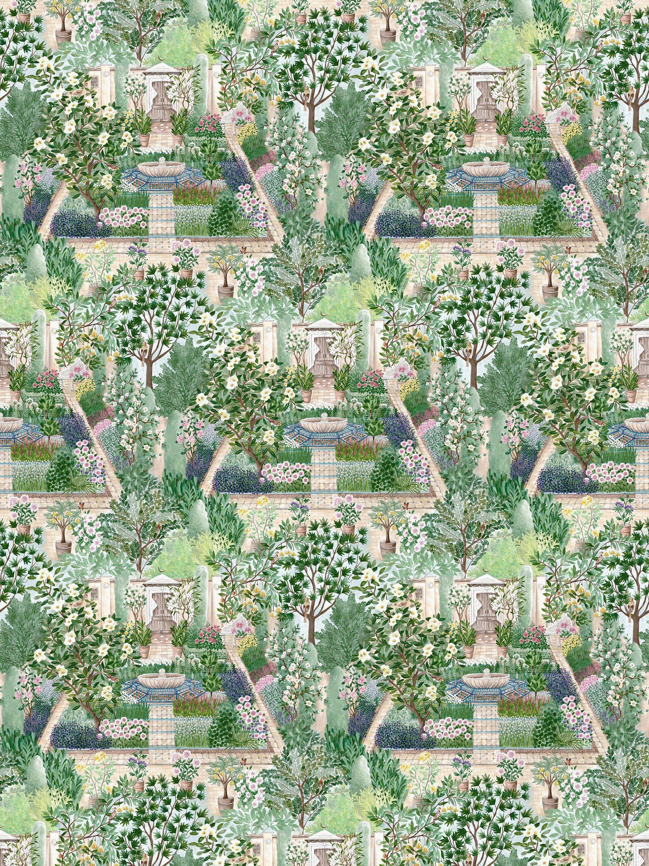 Sanderson's Carpet Garden Wallpaper Mural brings the luscious Highgrove scene directly to your interior space. Inspired by an original sketch from King Charles III, this design captures intricate geometric shapes and rich colours faithfully. This Sanctuary mural offers depth and artistic heritage for any contemporary room.