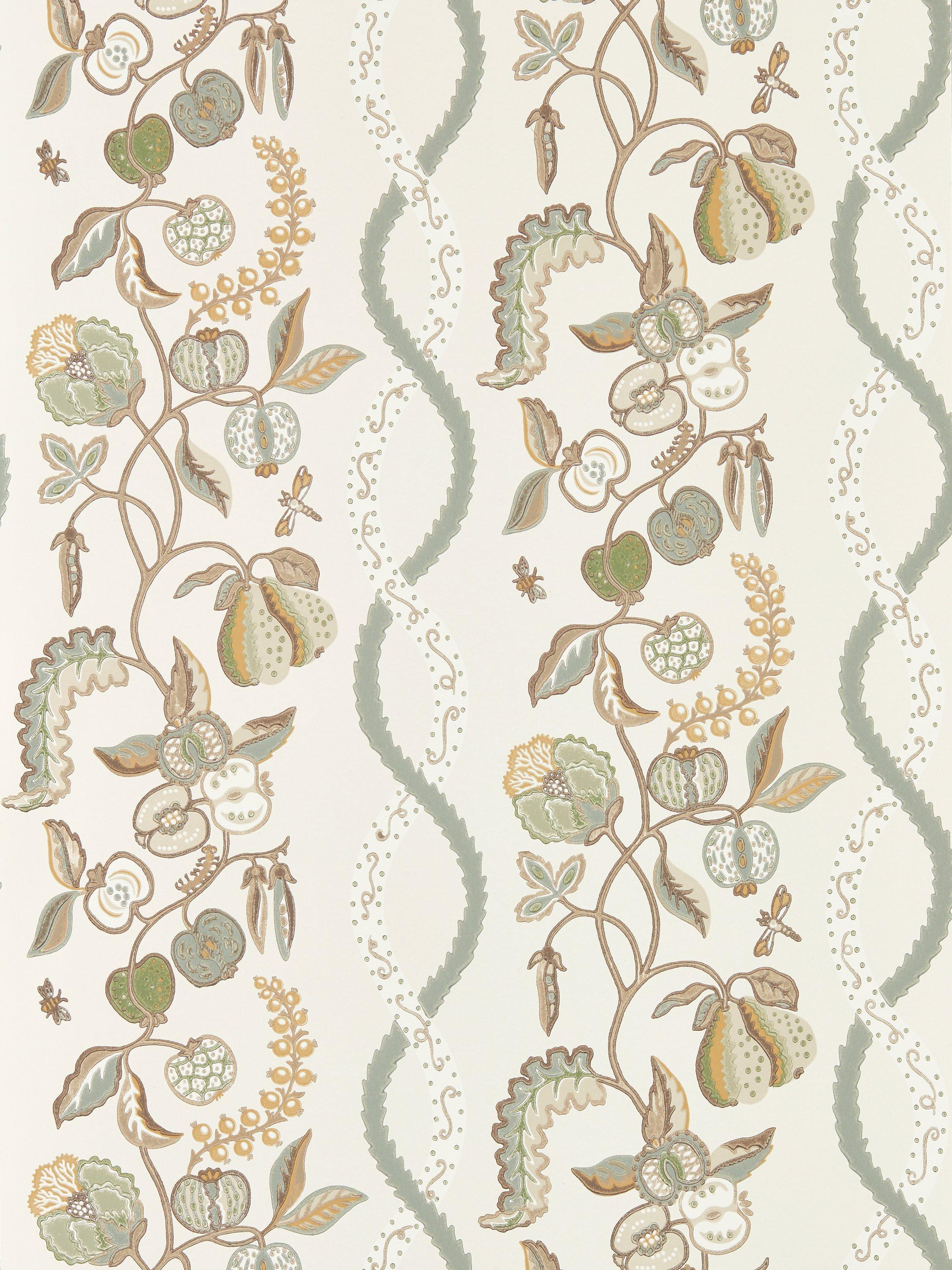Sanderson The Kitchen Garden Wallpaper introduces rich, traditional English garden artistry onto your interior walls. This beautiful surface printed design illustrates pears, apples, and runner beans growing amongst detailed foliage. The distinctive ribbon trail design cleverly nods towards the iconic pleached apple tunnel found within the famed Highgrove grounds. This botanical pattern offers unique charm.