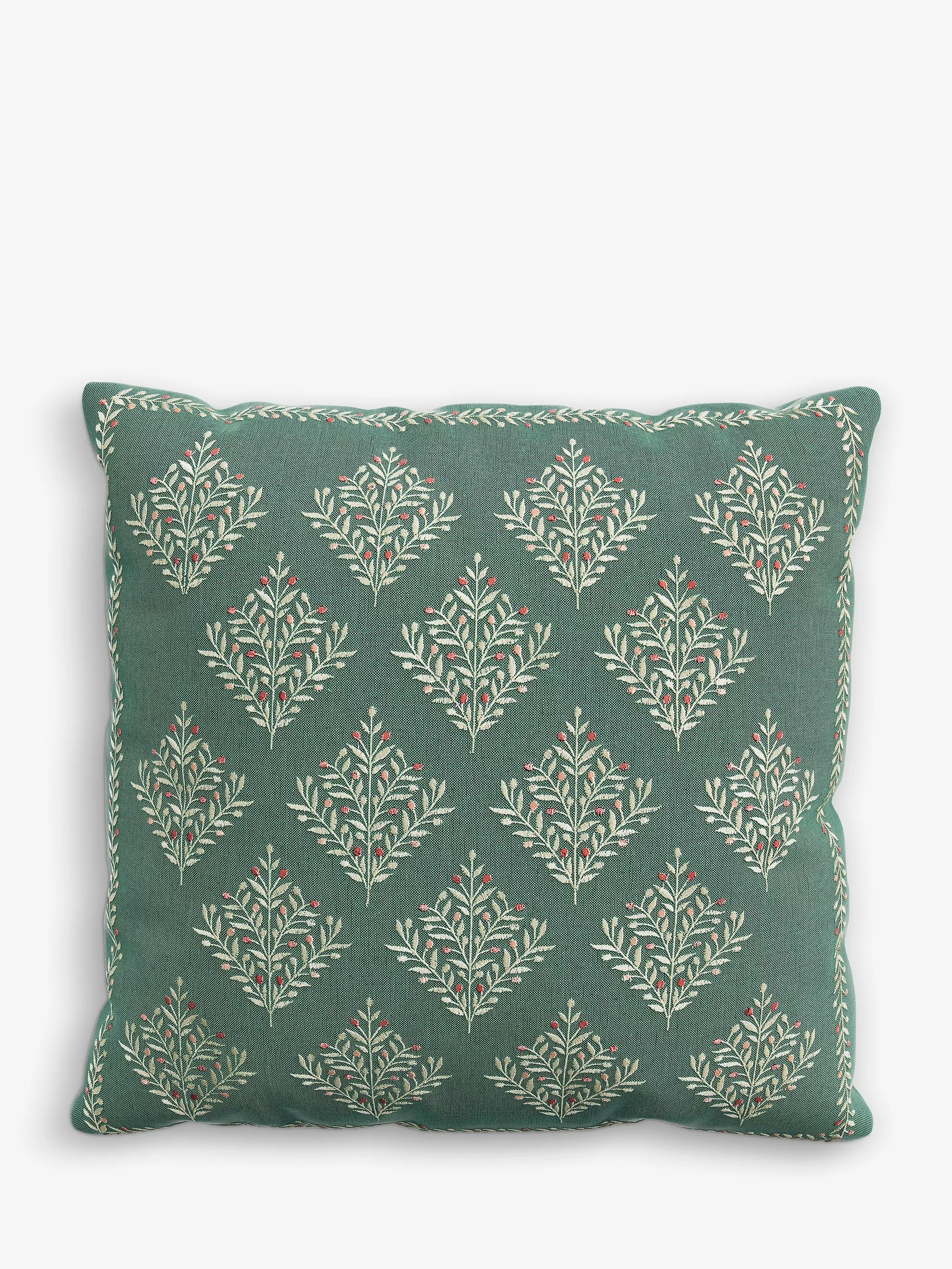 This cushion is a square design with a detailed, embroidered vine like border and ornate central motifs that represent trees. The front of the cushion is a linen/cotton mix, while the reverse is a plain cotton.
