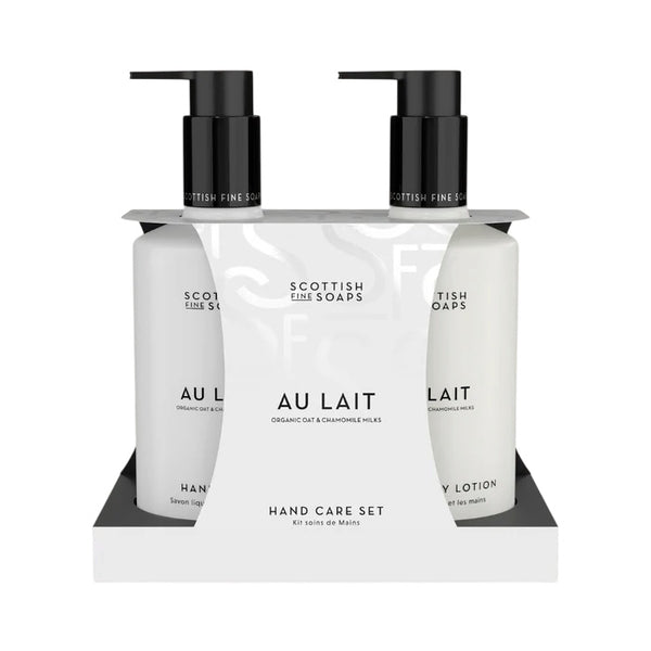 Hand Wash 300ml & Hand & Body Lotion 300ml duo With Scottish oat & chamomile milks Gently cleanses, hydrates & protects Creamy milk, violet & sandalwood scent Ideal for everyday use Vegan-friendly Made in Scotland Care for your hands with the nourishing Au Lait Hand Care Set, a beautifully balanced duo featuring a gentle Hand Wash and a moisturising Hand & Body Lotion. Enriched with Scottish oat and chamomile milks, this set is designed to replenish, soothe and protect hardworking hands. These naturally calming ingredients offer antioxidant benefits, while the elegant scent of creamy milk, violet and sandalwood adds a subtle touch of luxury to everyday routines. A perfect pairing for kitchen or bathroom sinks, and a thoughtful gift option too.