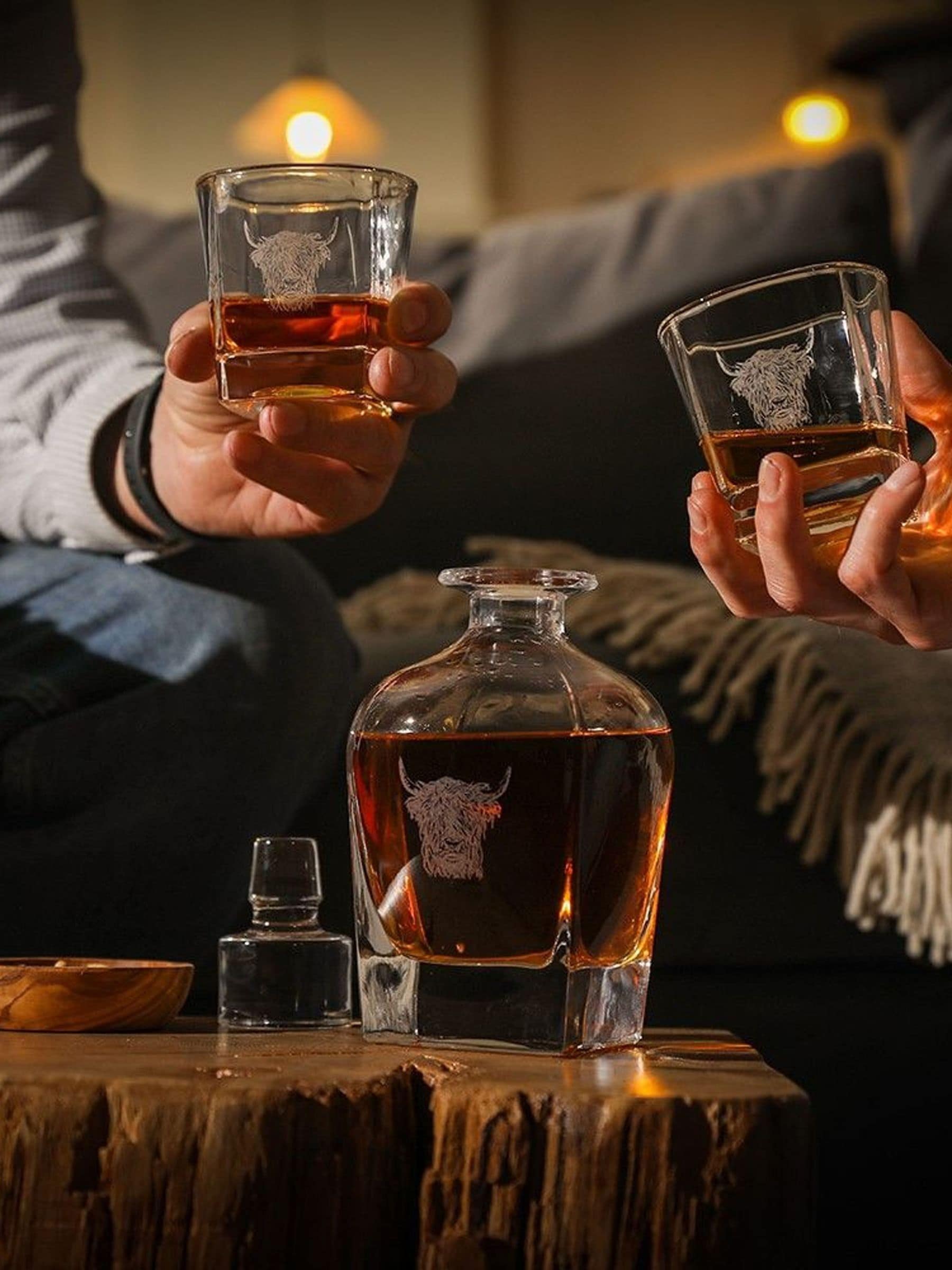 Immerse yourself in the rustic charm of the Highlands with our Highland Cow Decanter & Glass Set, showcasing a delightful Highland cow engraving on each glass tumbler and the decanter. This set infuses a sense of natural charm into your drinking rituals. Crafted to combine style with practicality, this set arrives in a beautifully designed gift box, making it an ideal present for those who appreciate the beauty of the Highlands and the indulgence of premium spirits.