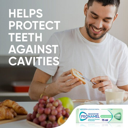 Sensodyne Pronamel Daily Protection has a unique formulation. It actively strengthens and re-hardens acid-weakened enamel, making it strong, healthy and better protected from the effects of everyday acids. Always follow the label: Brush twice a day and no more than three times, minimise swallowing and spit out. If irritation occurs, discontinue use. Talk to your dentist or doctor as soon as possible if you experience swelling of the mouth or face. Sensitive teeth may indicate an underlying problem that needs prompt care. If symptoms persist or worsen see your dentist. Keep out of reach of children. Not for use by children under 12 years of age unless on advice of a dental professional or doctor. The ends of this carton have been glued down. Do not use if the carton ends are open. WHO IS IT FOR? Sensodyne Pronamel Daily Protection is for everyone aged 12 years and over, who wants to care for their enamel surface.