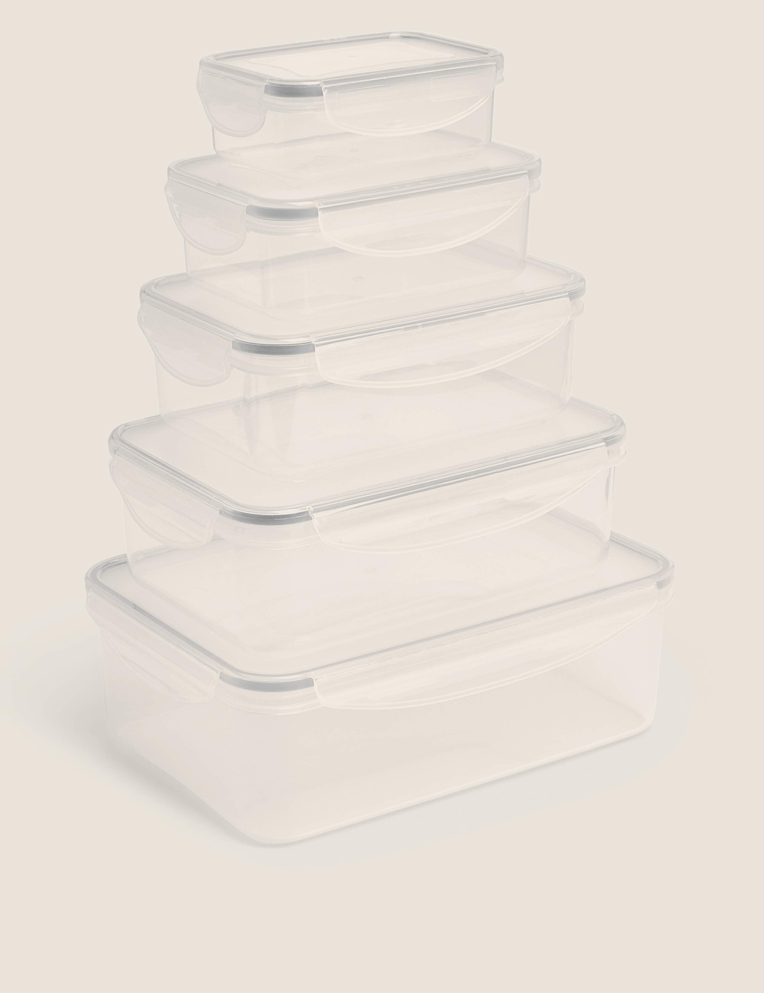 Read MoreKeep your kitchen tidy with this set of plastic storage tubs. With five different sizes, they're ideal for storing all kinds of leftovers in the fridge. The clip lid can be removed for microwave use, and the tubs can be cleaned in the dishwasher.