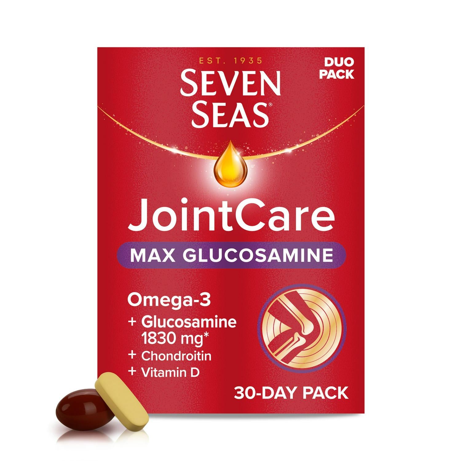 CONTENTS: x30 capsules of Seven Seas JointCare, with Omega-3, Glucosamine and Chondroitin. Plus, Vitamins C and D, Zinc and Manganese to support an active lifestyle1-4. x30 Glucosamine tablets. 30-day duo pack