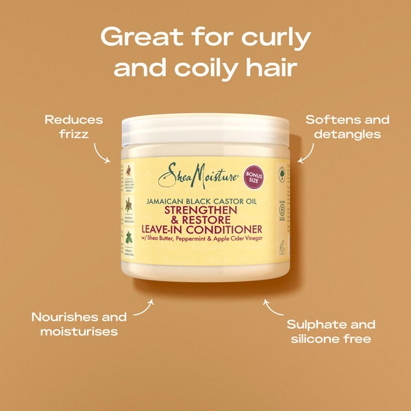 sheamoisture jamaican black castor oil strengthen restore leavein conditioner is designed for those who regularly colour straighten perm or heat style their hair as well as coily curly or wavy natural hair the jamaican black castor oil and fair trade shea butter from ghana are natural and effective ingredients that help to nourish moisturise and support elasticity so that hair resists breakage when detangling peppermint oil helps invigorate the scalp for a tingling experience this conditioner provides a protective layer that improves the appearance of split ends and leaves hair soft and frizzfree for best results use jamaican black castor oil strengthen restore shampoo and conditioner together to cleanse and strengthen hair how to use apply a generous amount to clean toweldried hair from roots to ends gently comb for even distribution do not rinse this conditioner contains no nasties such as sulphates silicones parabens phthalates or mineral oils sheamoisture products are powered by sustainably sourced trusted ingredients and have been tested on friends and family for generations but never on animals try other hair products from the range such as the strengthen restore shampoo strengthen restore conditioner and strengthen restore treatment masque sheamoisture is the legacy of sofi tucker a pioneering mother of four and an entrepreneur who sold shea butter african black soap and homemade beauty preparations in sierra leone in 1912 we honour her vision by continuing to formulate with raw shea butter handcrafted by women in africa every purchase of sheamoisture products powers the community commerce model that nurtures investment in our communitiessheamoisture jamaican black castor oil strengthen restore leavein conditioner softens and detangles hairthis reparative conditioner nourishes hair with ultramoisturising and nutrientrich jamaican black castor oil fair trade shea butter apple cider vinegar and stimulating peppermintsheamoisture has delivered the perfect leavein conditioner for those who regularly colour straighten perm or heat style their hair as well as curly coily or wavy natural hairused together with jamaican black castor oil strengthen restore shampoo this rinsefree conditioner provides a protective layer and supports elasticity improving the appearance of split endsall sheamoisture hair care products are ethically traded sustainably produced and crueltyfree and with every purchase you show support of our mission to reinvest in our communitiessheamoisture products like this strengthening leavein conditioner contain only natural goodness no sulphates or silicones