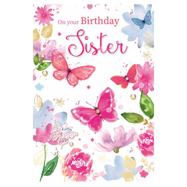 Material: Card. Design: Butterflies, Flowers, Leaves, Printed, Text. Contents: 6 Envelopes. Occasion: Birthday. Card Recipient: Sister.