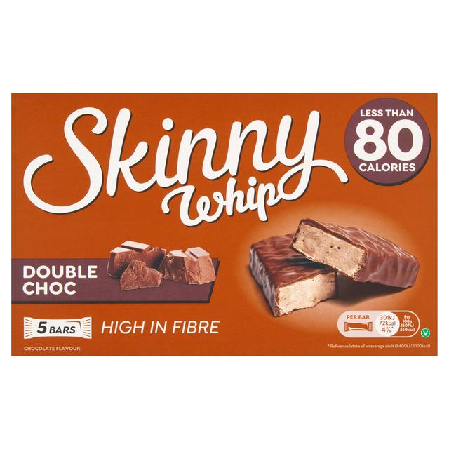 These Skinny Whip Double Choc bars consist of chocolate-flavoured nougat wrapped in a milk chocolate flavoured coating. Each pre-portioned bar makes for a convenient treat suitable for monitoring your intake. This product is also certified as suitable for vegetarian diets.