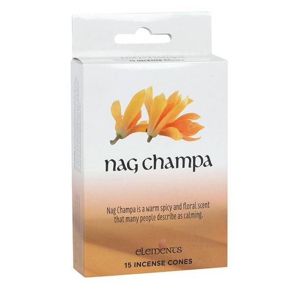 Nag Champa fragranced incense cones by Elements. Warm, spicy and floral scent. Each pack contains 15 incense cones.