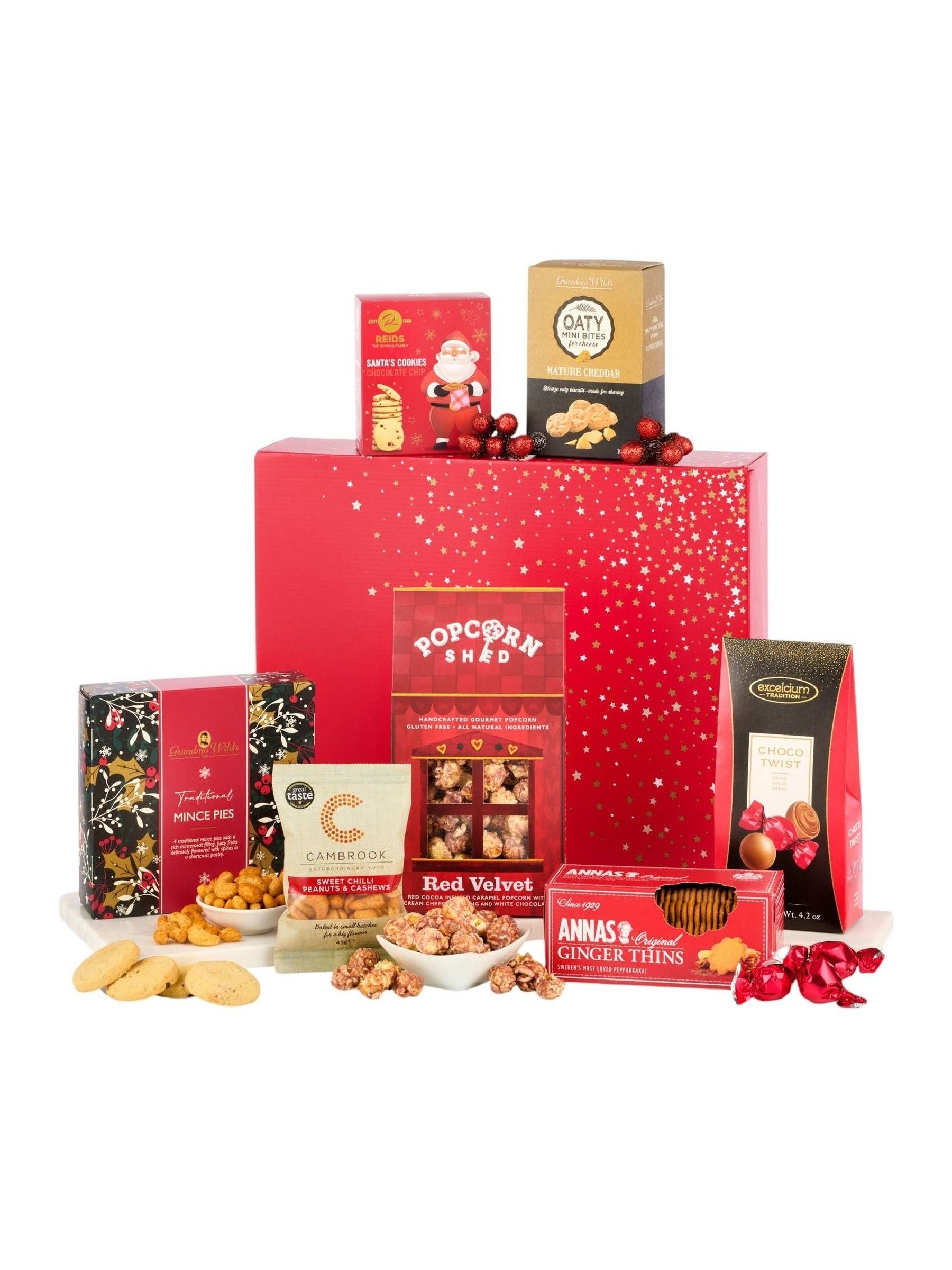 Grandma wilds 4 traditional mince pies. Popcorn shed red velvet popcorn 80g. Cambrook baked sweet chilli peanuts & cashews 45g. Anna's ginger thins 150g. Grandma wilds mini bites mature cheddar 100g. Reid's shortbread santa cookies 150g. Excelcium choco twist cacao 120g. Packed in a red gift box.
