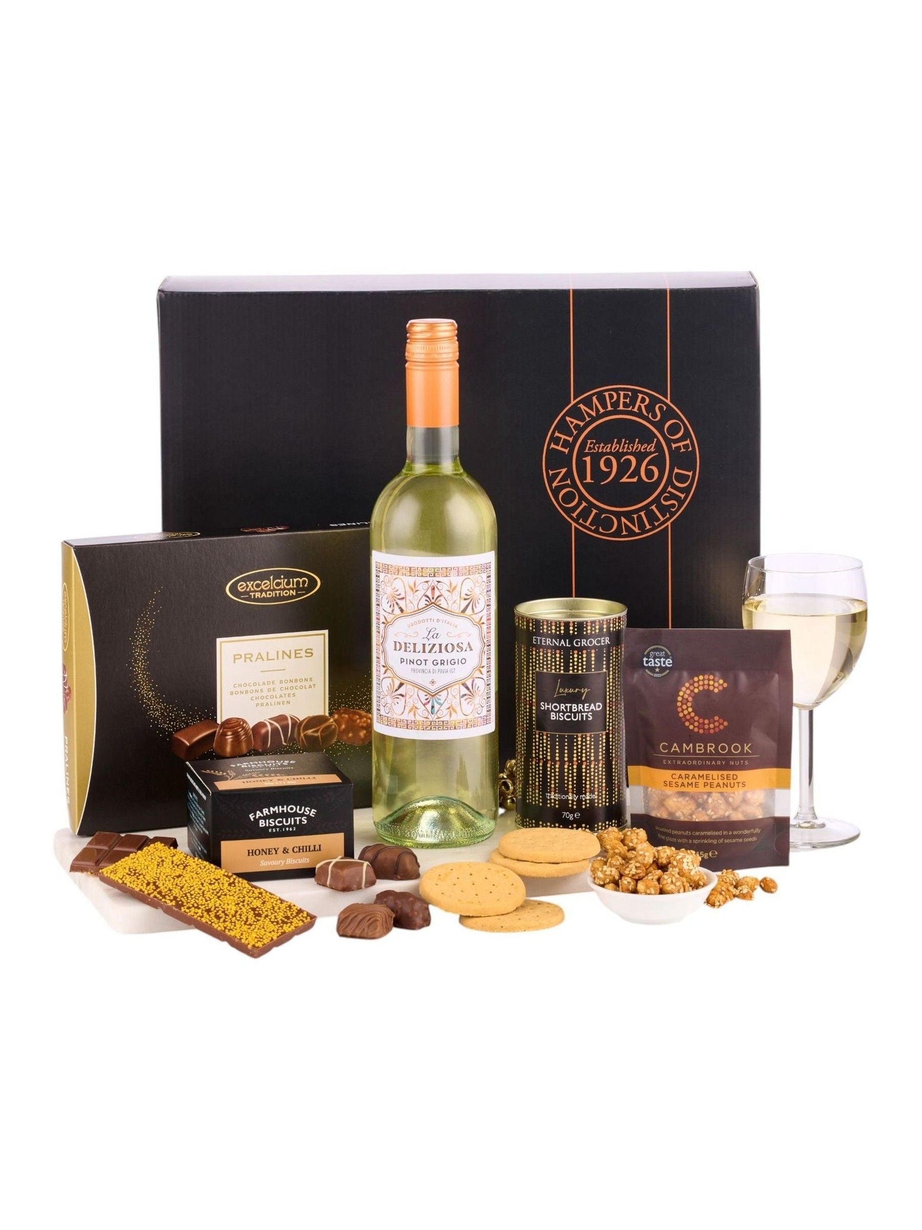 La Deliziosa Pinot Grigio 75cl. Farmhouse Honey & Chilli Biscuits 50g. Thornton & France Milk Chocolate Bar with Sprinkles 40g. Cambrook Caramelised Sesame Peanuts 45g. Excelcium Pralines 180g. Eternal Grocer Shortbread Biscuits. 70g Packed in a Black Gift Box. Read More