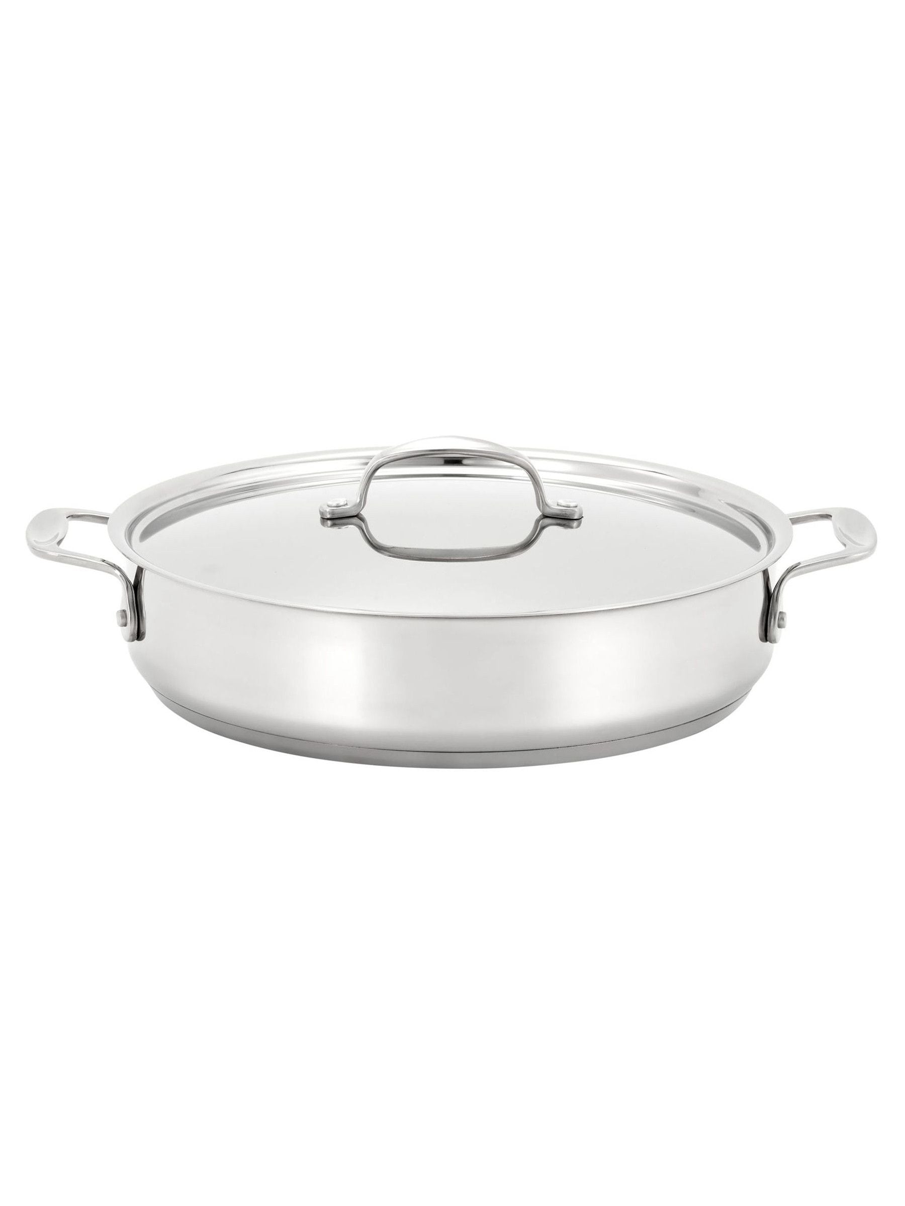 Perfect for starting on the hob and finishing in the oven. This 28cm shallow casserole dish features an uncoated stainless steel interior – ideal for confident home chefs who love to sear, deglaze and build rich, caramelised flavours. The high-conductivity base ensures fast, even heat distribution across all hob types, including induction. Strong cast handles offer secure handling from stove to oven, with performance that holds steady up to 240°C. With its polished finish and elegant profile, this versatile pan looks just as good on the table as it does on the hob, perfect for serving straight from oven to guests. Key details. Material: Uncoated Stainless Steel – 18/10. Dishwasher safe. Suitable for Gas, Halogen, Ceramic & Solid Plate. Induction suitable. Oven safe up to 240°C. Stellar Lifetime Guarantee. External Measurements Height: 10.0cm Width: 29.5cm Length: 37.0cm. Size : 0.
